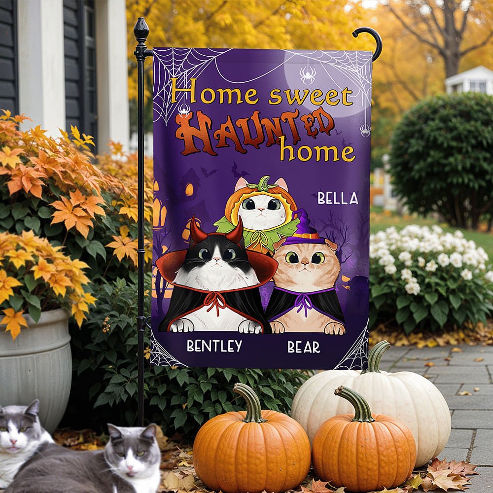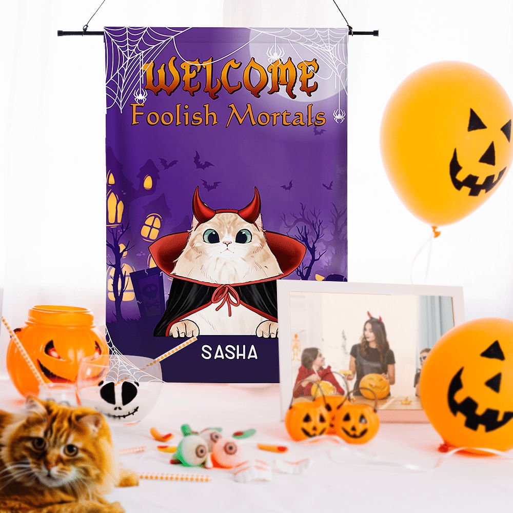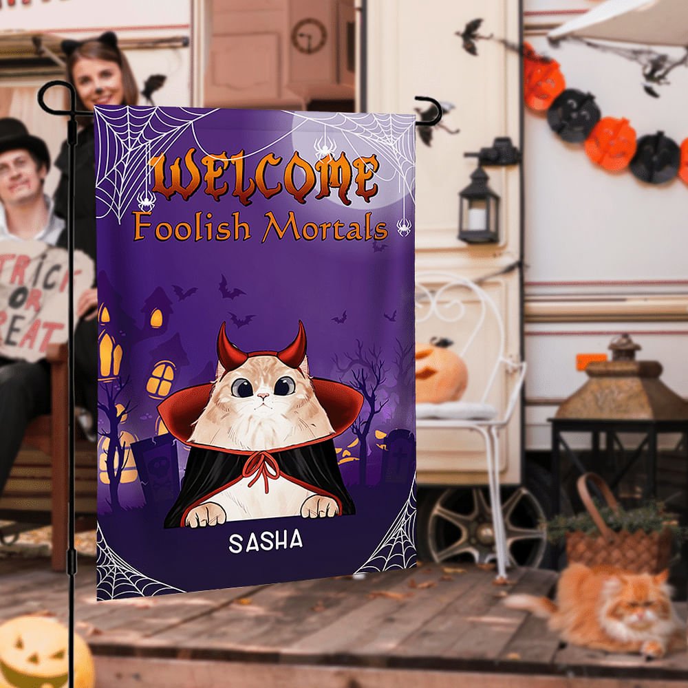 Denna trädgårdsflagga har ett bedårande Halloween-tema med katter som leker häxor, vampyrer, pumpor och mumier. Det är ett roligt och kusligt tillägg till alla trädgårdar och verandor, perfekt för att fira Halloween.