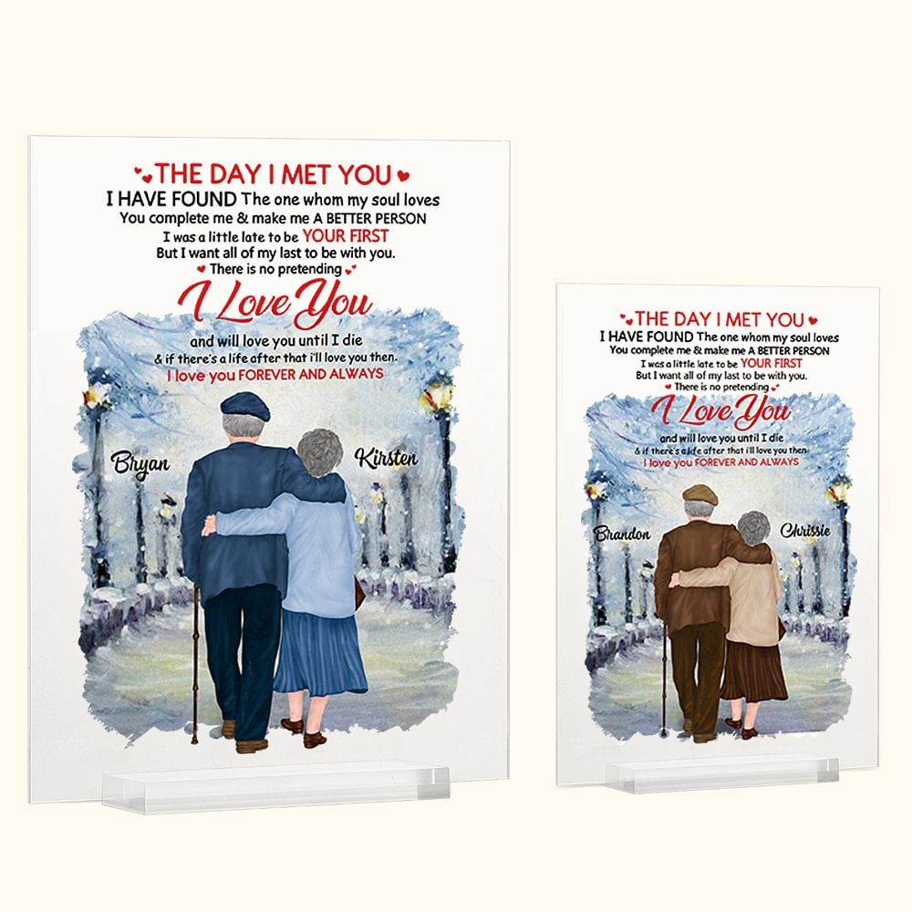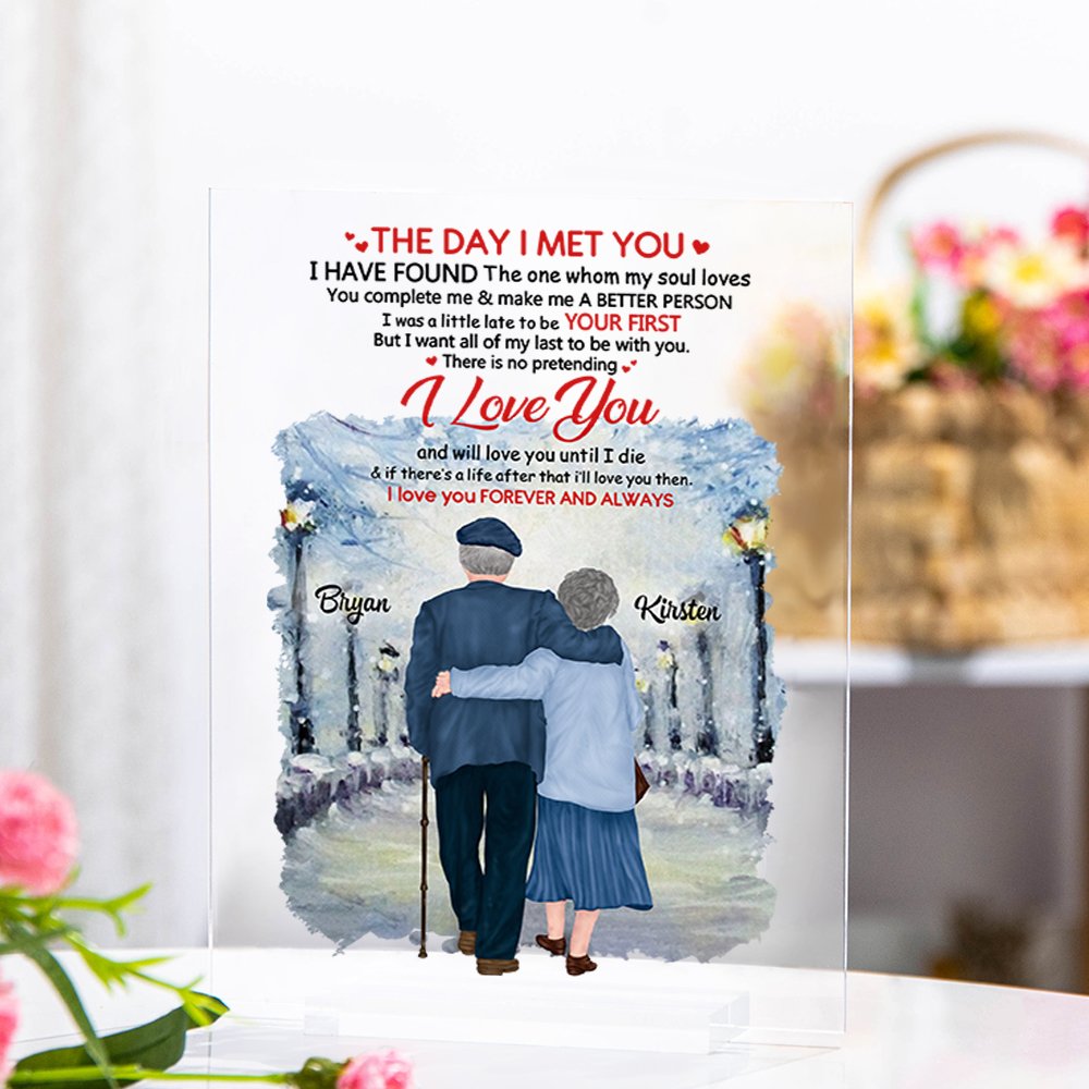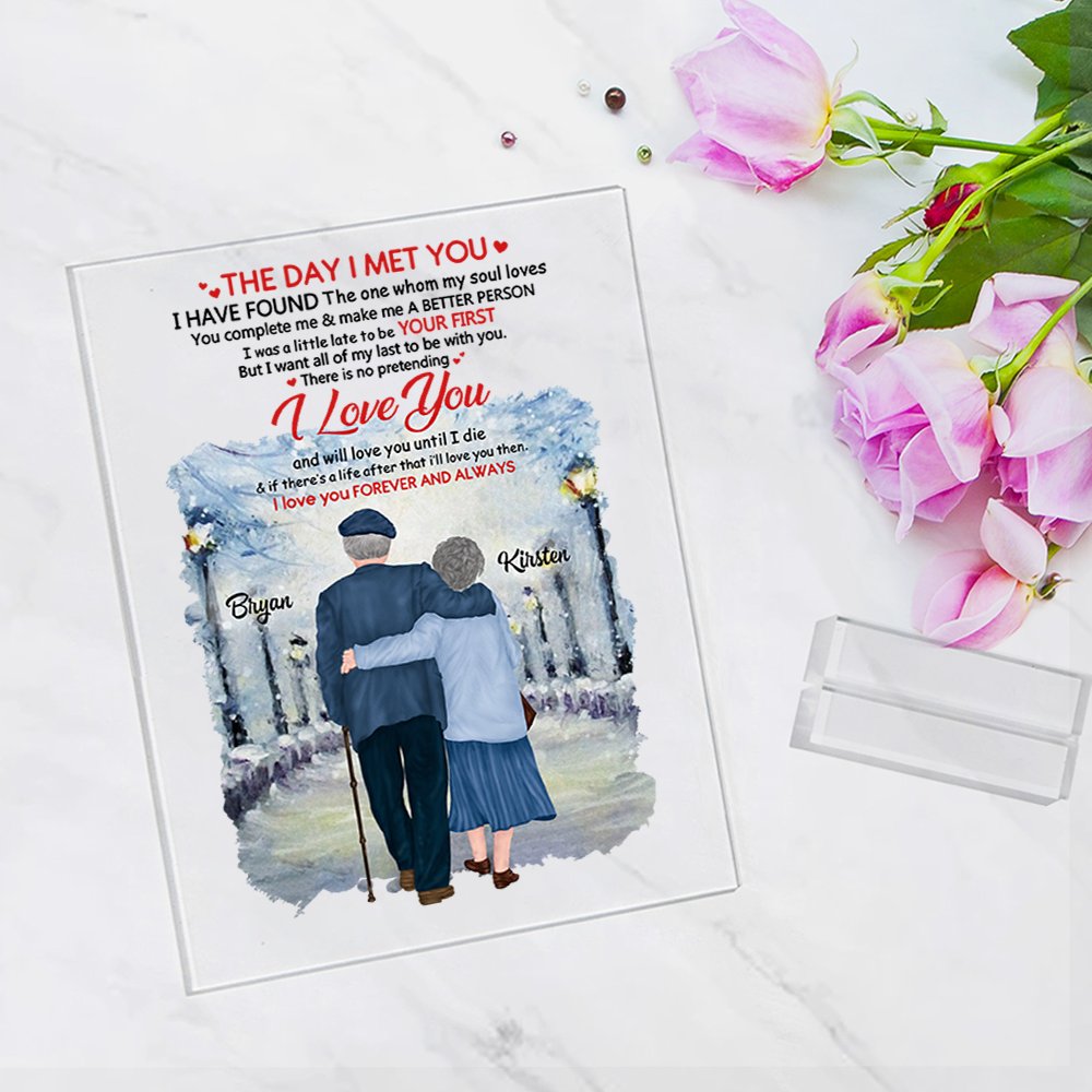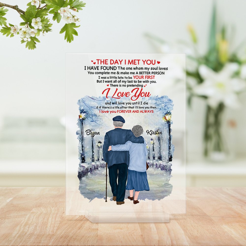 Akryldekorationen är personlig med baksidan av ett gammalt par, du kan anpassa namn, frisyrer och klädstil och skapa en unik scen med en kärleksdikt som uttrycker din kärlek till din familjemedlem.