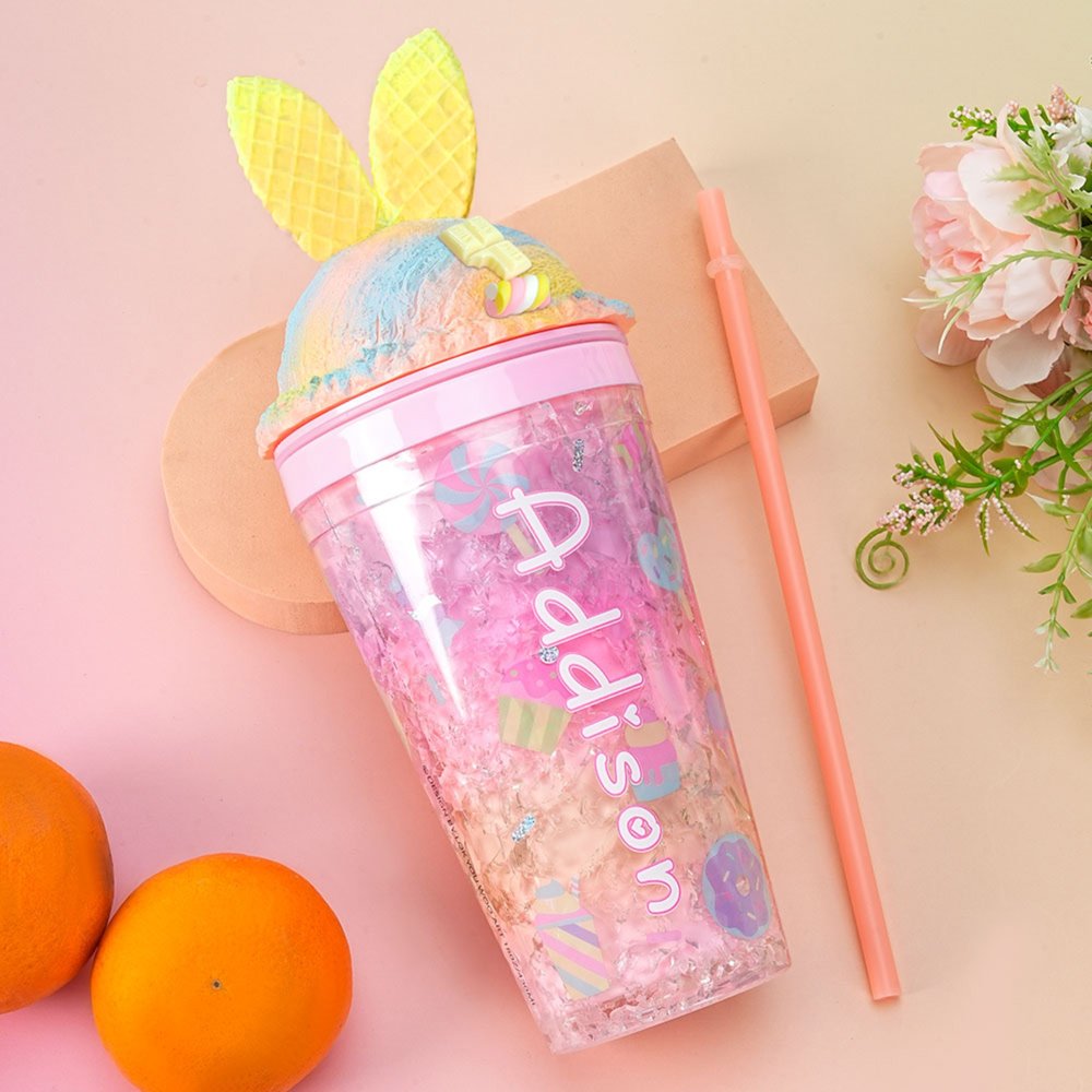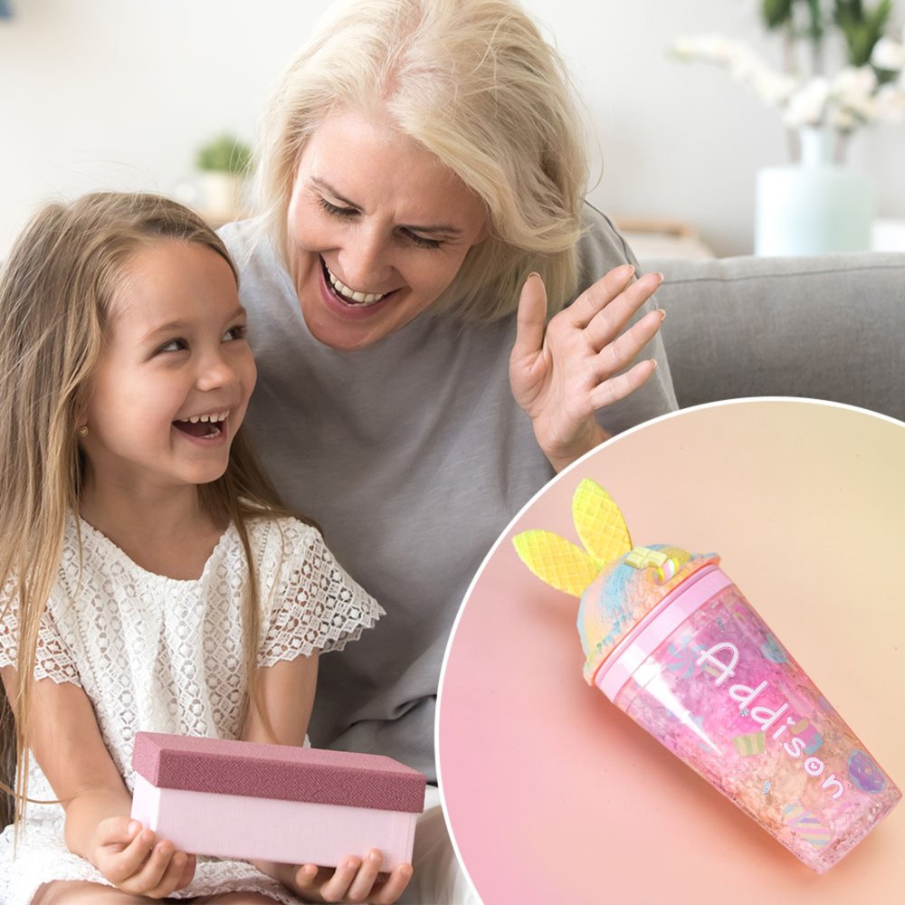 Denna vattenflaska har lekfulla godisfärgade nyanser som fångar ögat med sin nyckfulla charm. Locket är utformat som en glass, komplett med våffelstrukturerade kaninöron och bedårande marshmallowdekorationer. Vi erbjuder tre färgalternativ för vattenflaskor, så att du kan välja din favorit. Gör den personlig med dina barns namn i ett av tre snygga typsnitt för att matcha deras unika personligheter.