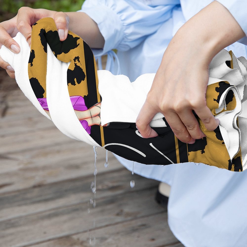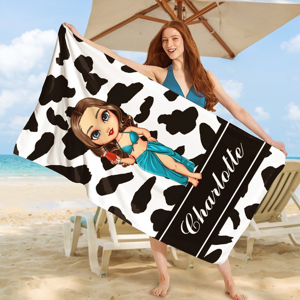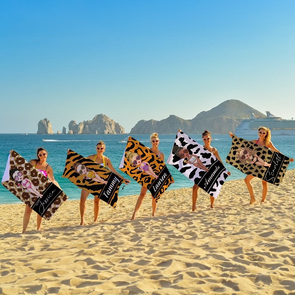 Strandhandduken har en design med en kvinnlig seriefigur och en texturerad design som imiterar djurpäls, vilket är både lekfullt och vilt. Du kan också trycka ditt namn på strandhandduken för att visa din personlighet till fullo.