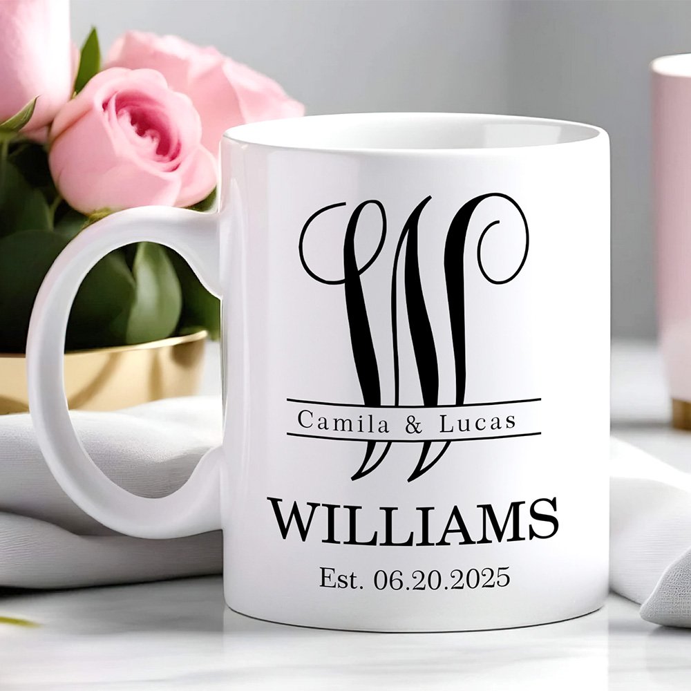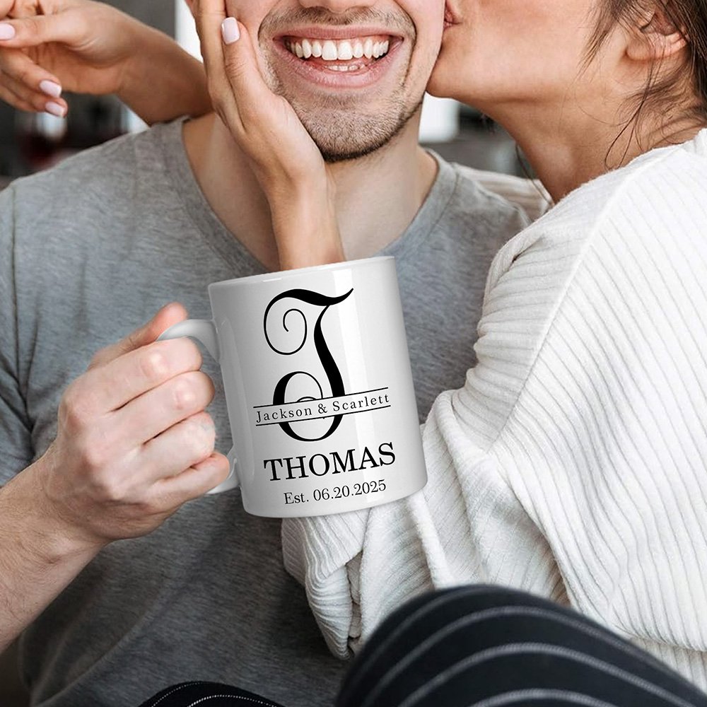 Denna personliga keramikmugg är designad med en stor initial i en elegant, konstnärlig stil som blandar romantik med en modern estetik. Parets namn, släktnamn och bröllopsdatum kan också läggas till för att skapa en tidlös minnessak.