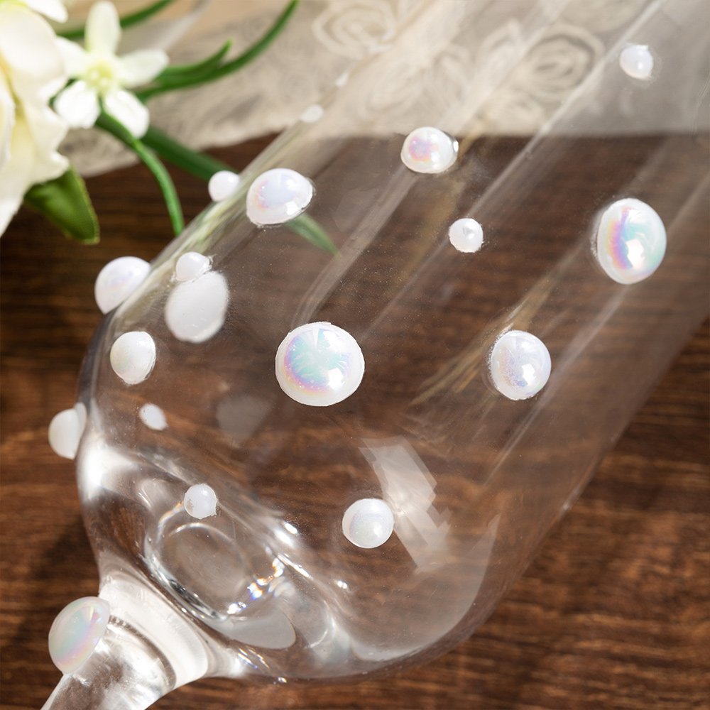 The pearl champagne flute with a long stem features a beautiful and classy design. Each pearl is hand glued on glass, it means each champagne flute is one of kind. The pearl finish adds a touch of sophistication, making them perfect for special occasions such as weddings or anniversary celebrations.