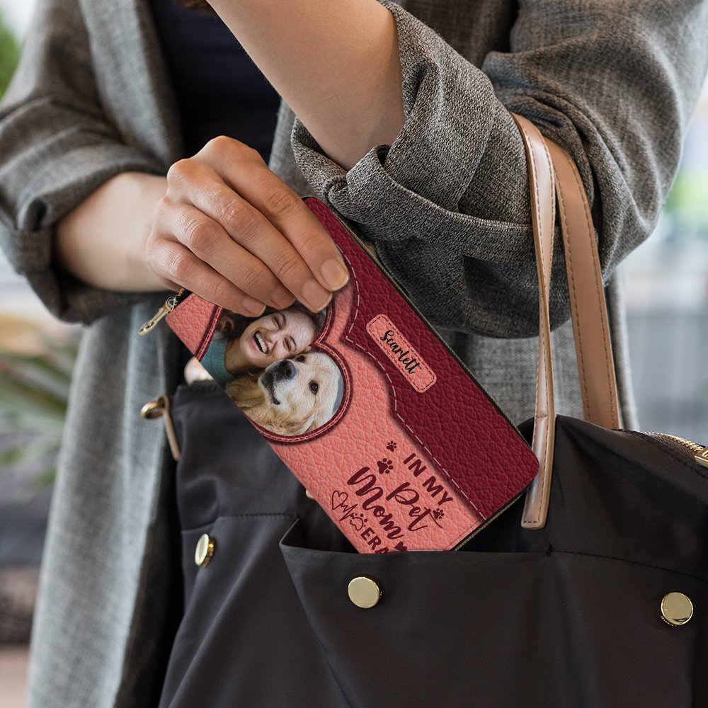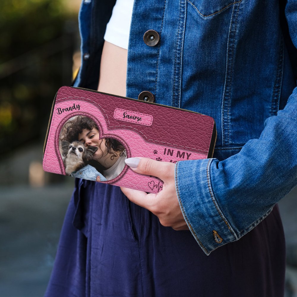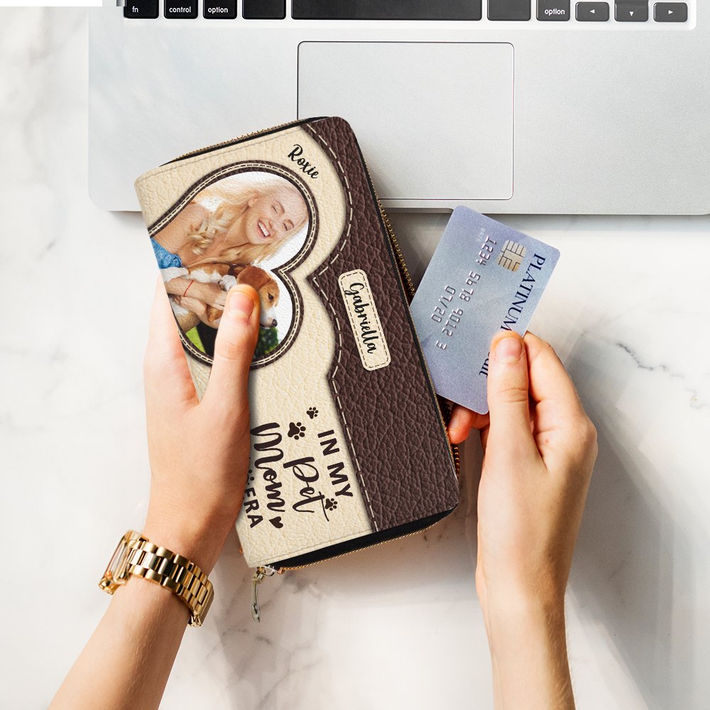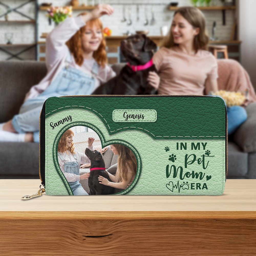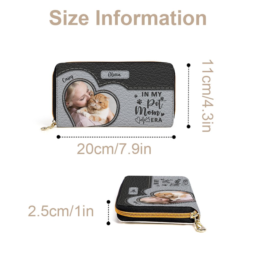 Denna plånbok för kvinnor har 8 olika färger, plånbokens design är snygg och varm, plånbokens framsida är tryckt med ett hjärtformat foto av husdjuret och höger sida av det är tryckt med orden "i min husdjursmamma era". du kan också anpassa husdjurets namn på plånboken så att plånboken blir mer personlig.
