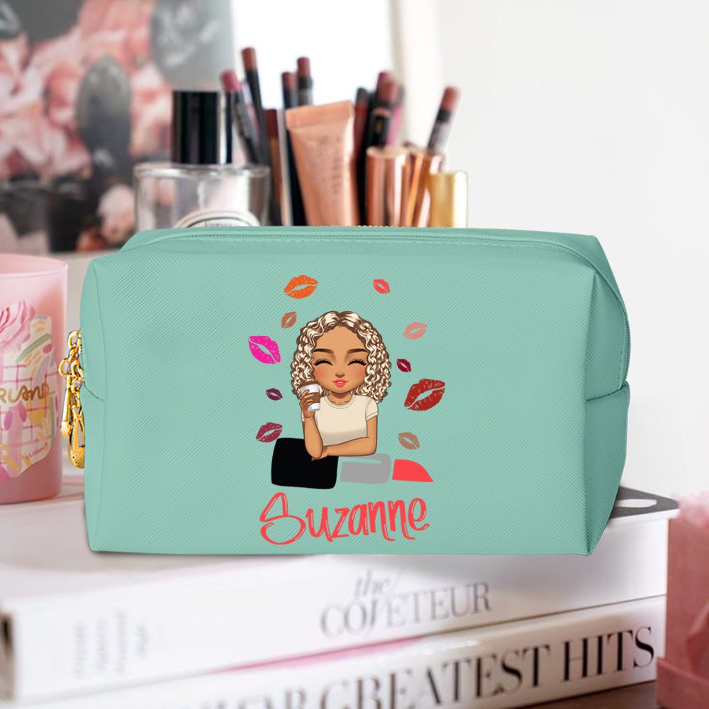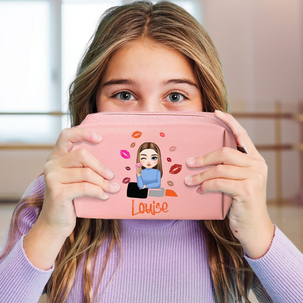 Den här eleganta sminkväskan föreställer en fashionabel flicka i kombination med klassiska läppstiftsmotiv, vilket perfekt fångar elegans och självförtroende. Med sin blandning av modeinriktad design och personlig anpassning förkroppsligar denna sminkväska idén att "mode är självuttryck".