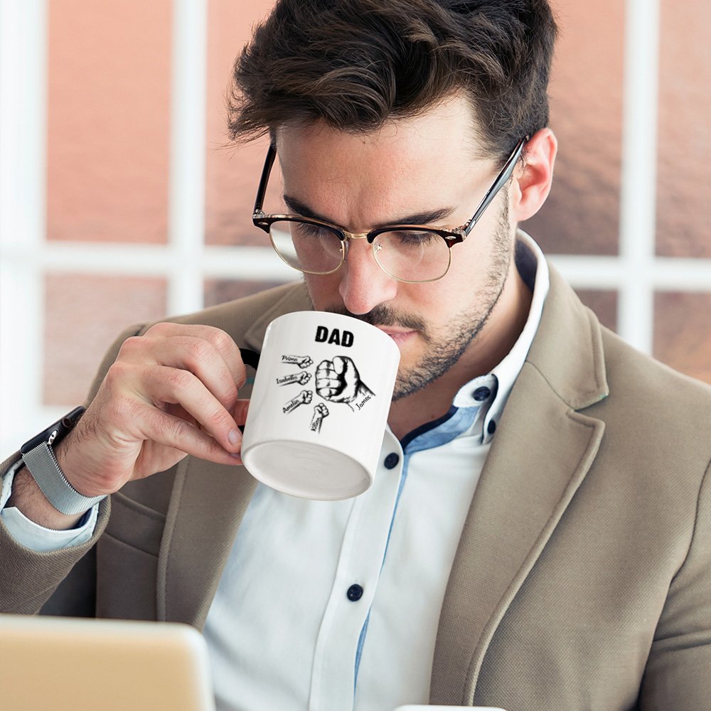 The mug uses the clashing fists of father and children as a design element, symbolizing strength, unity, and love. You can add the father's title and children's names to the ceramic wall of the mug to create a keepsake that is uniquely yours.