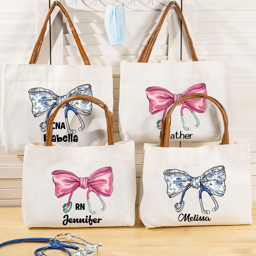 Denna tygväska har en snygg design med en rosa eller blå rosett och ett stetoskopmotiv. Kombinationen av elegans och praktiska egenskaper gör den till en perfekt accessoar för medicinsk personal. Anpassa väskan med deras jobbtitel och namn för att uttrycka ditt hjärtliga tack och din beundran för deras bidrag.