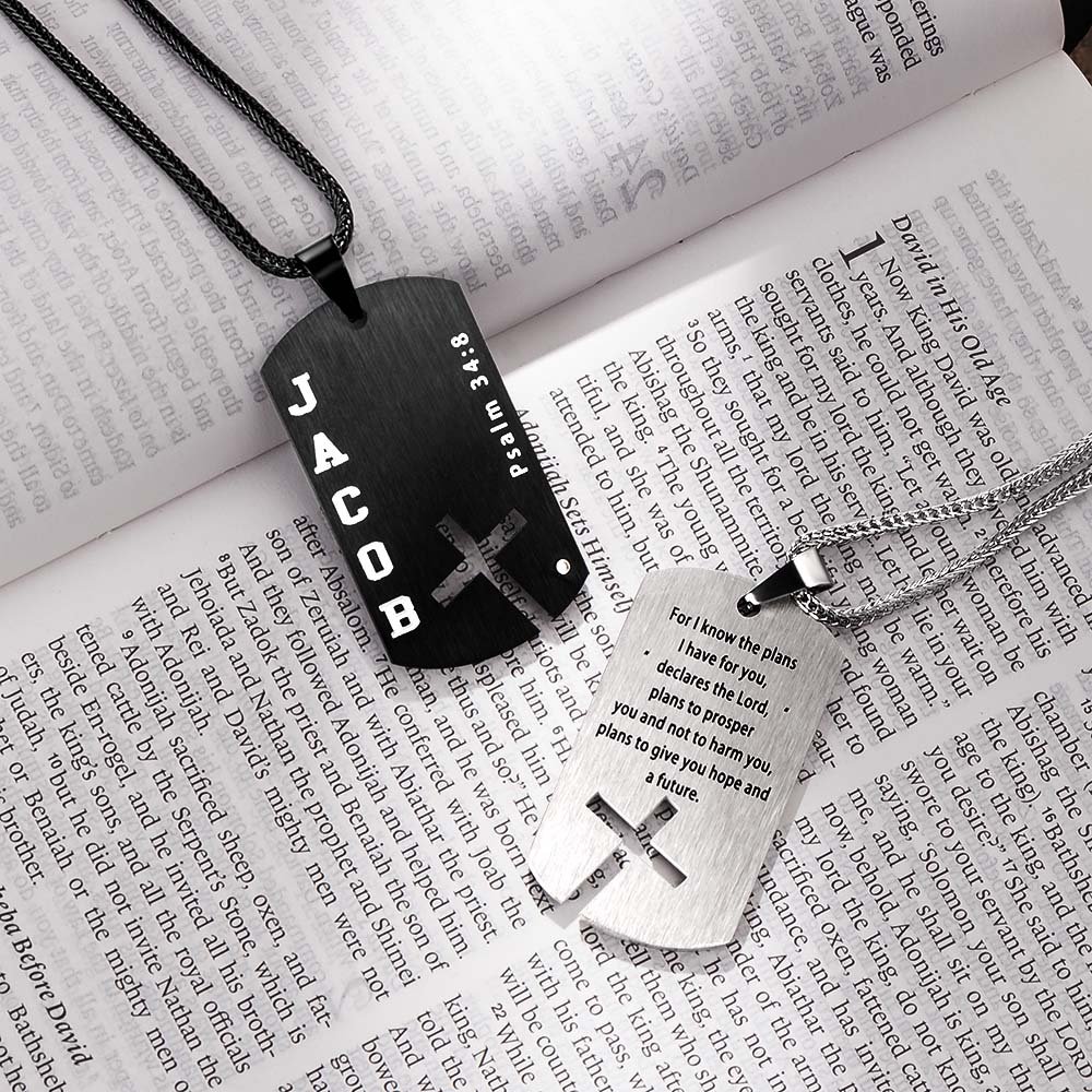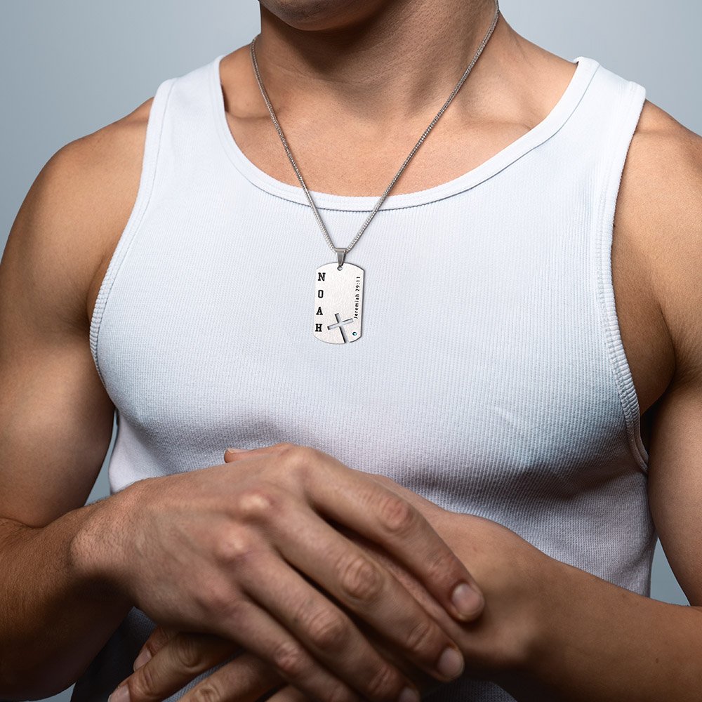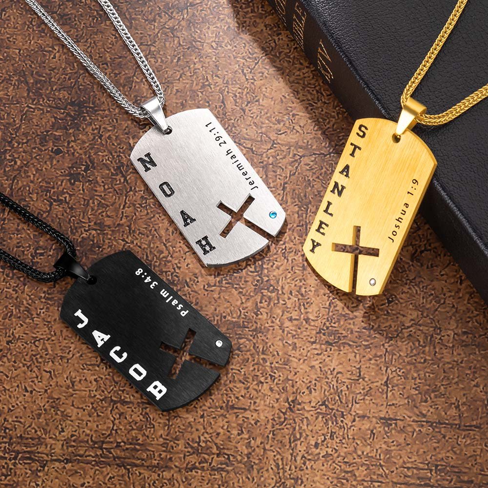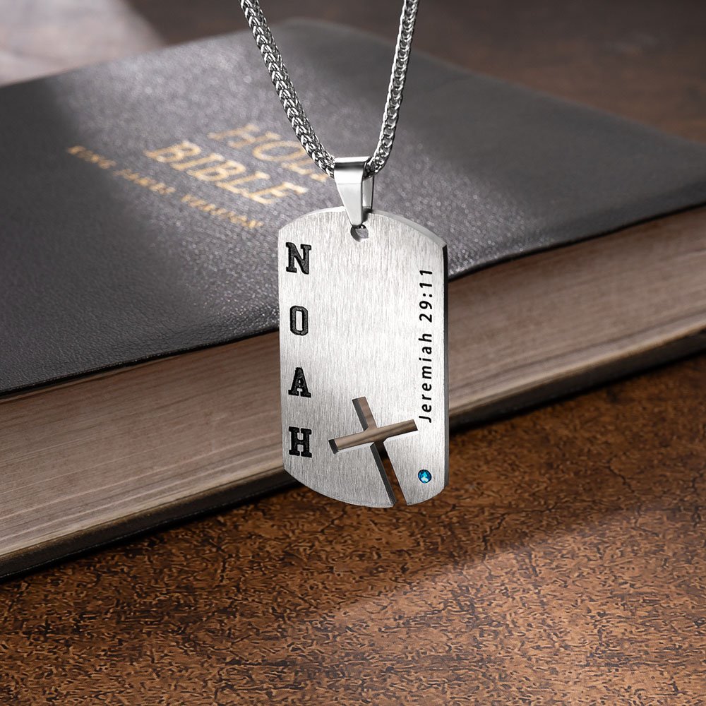 Detta halsband framhäver de utsökta religiösa elementen och de djupa bibliska konnotationerna. Korset är kärnan i designen och symboliserar tro och andlig vägledning. Födelsestenens design gör det ännu mer attraktivt. Halsbandet kan också anpassa texten och namnet, och du kan anpassa bibelverserna, så att de återspeglar den kristna tron, men också visar bärarens personlighet och smak.