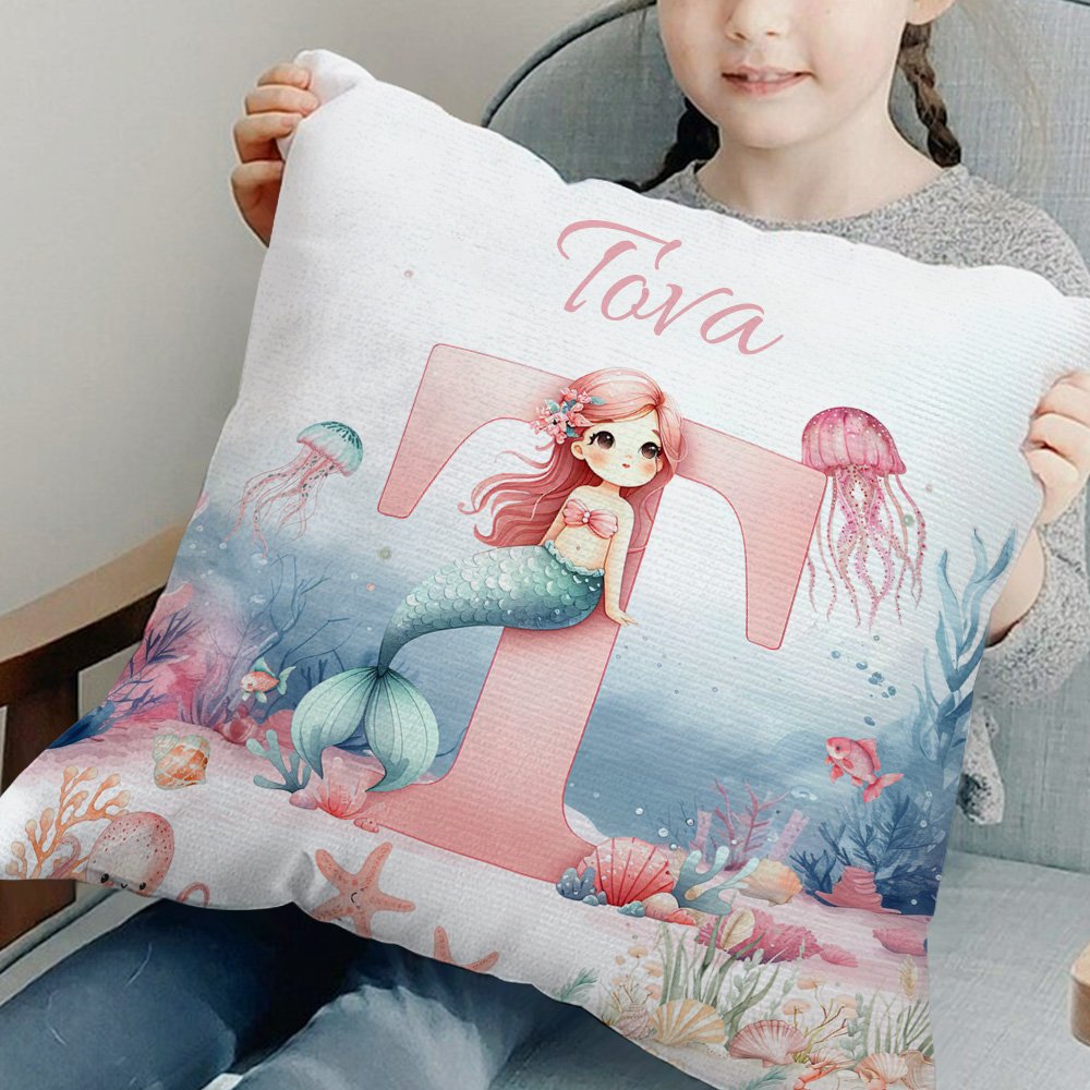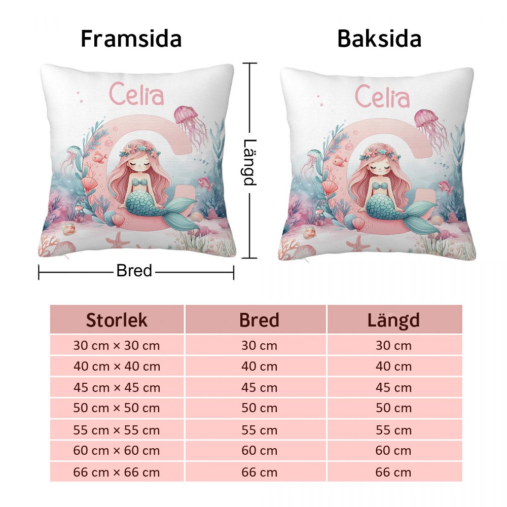 Kuddfodralet visar sjöjungfrur, snäckor, maneter, bläckfiskar och annat marint liv från undervattensvärlden. De livliga färgerna gör det till ett härligt tillskott i alla rum. Med anpassningsbara initialer och namn skapar det en unik atmosfär. Perfekt för ett barns sovrum eller lekplats.