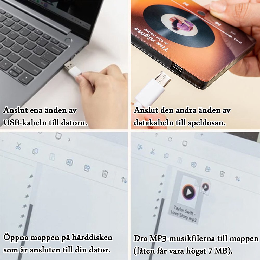 Anslut USB-datakabeln till datorn för att lagra musik (i MP3-format). Endast en låt med en maximal storlek på 7 MB kan lagras och spelas upp åt gången. För att byta ut den raderar du den ursprungliga musikfilen och laddar sedan ner och lagrar en ny. Klicka på knappen på speldosans framsida för att spela eller pausa.