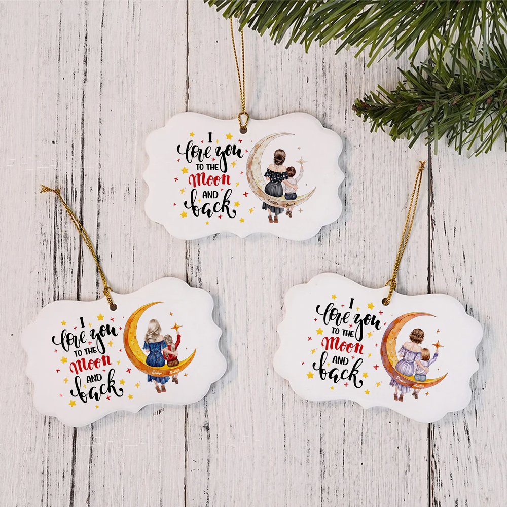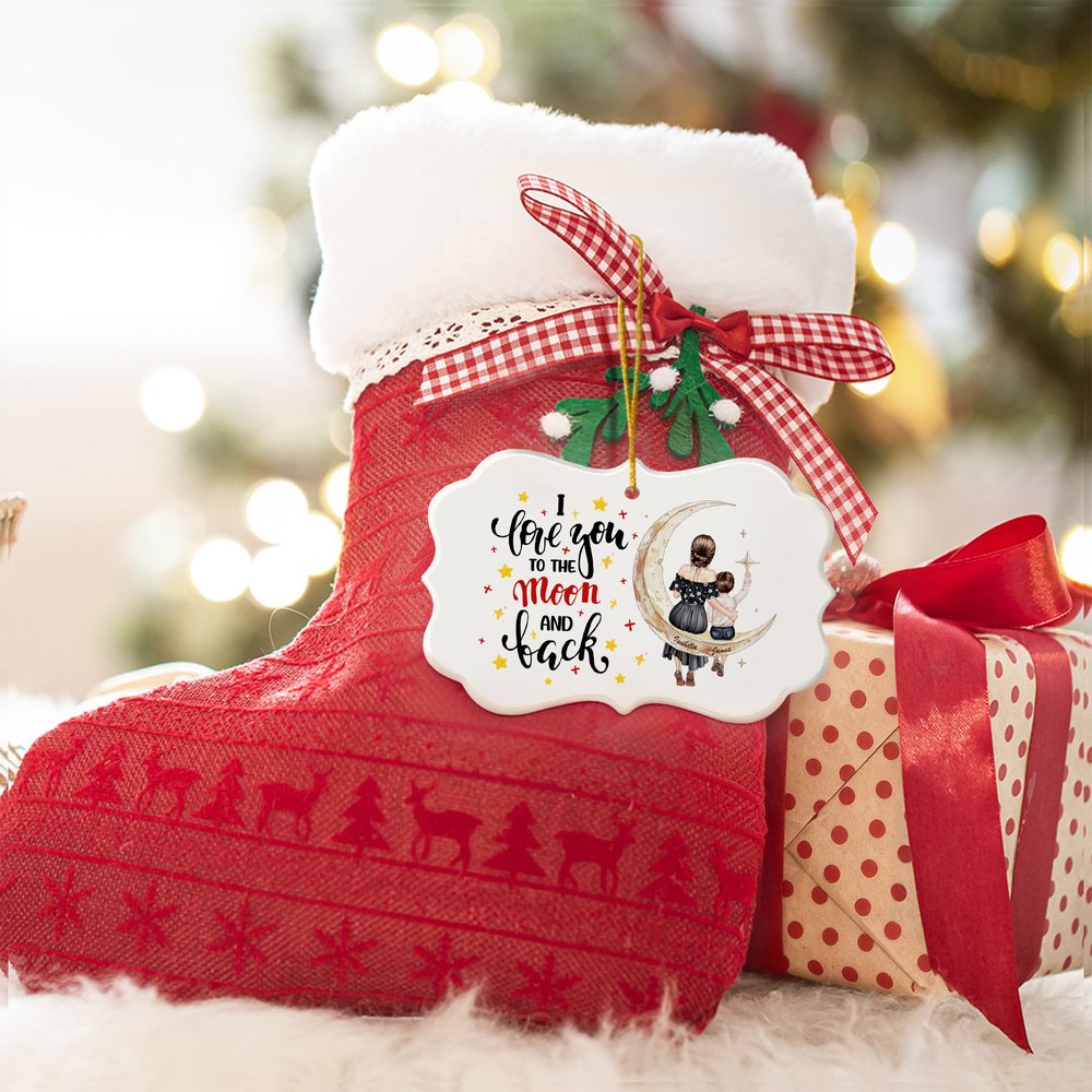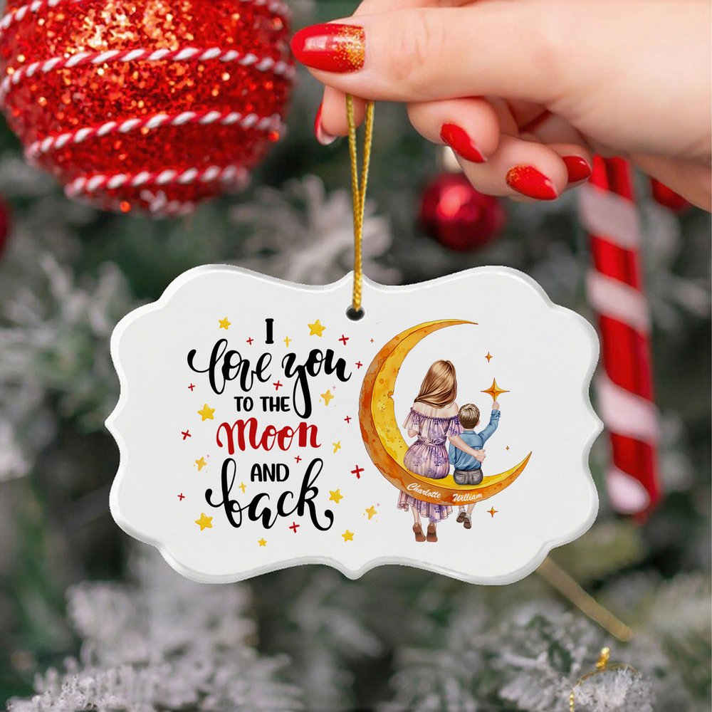 Med silhuetten av en mor och ett barn i centrum har detta smycke mån- och stjärnelement i kombination med ett anpassat namn och ett hjärtligt meddelande. Dess romantiska och mysiga stil utstrålar familjär tillgivenhet. Bilden av mor och barn som står sida vid sida och håller en stjärna förmedlar familjeband och hoppfulla visioner för framtiden, och bryter sig loss från monotonin hos konventionella ornament för att erbjuda konstnärlig överklagande och känslomässig resonans.