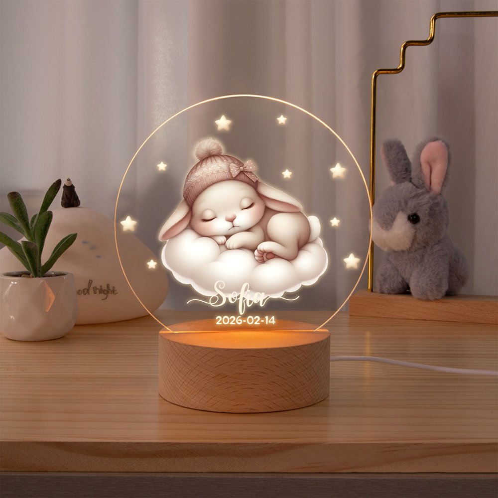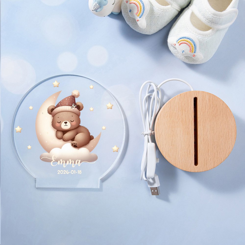 Denna nattlampa har en bedårande design med ett tecknat djur som sover på månen, omgiven av stjärnor, och skapar en drömsk atmosfär. Med 19 olika djurmotiv att välja mellan, kan du även anpassa lampan med barnets namn och födelsedatum, vilket gör varje lampa unik och personlig – perfekt för barnrum.