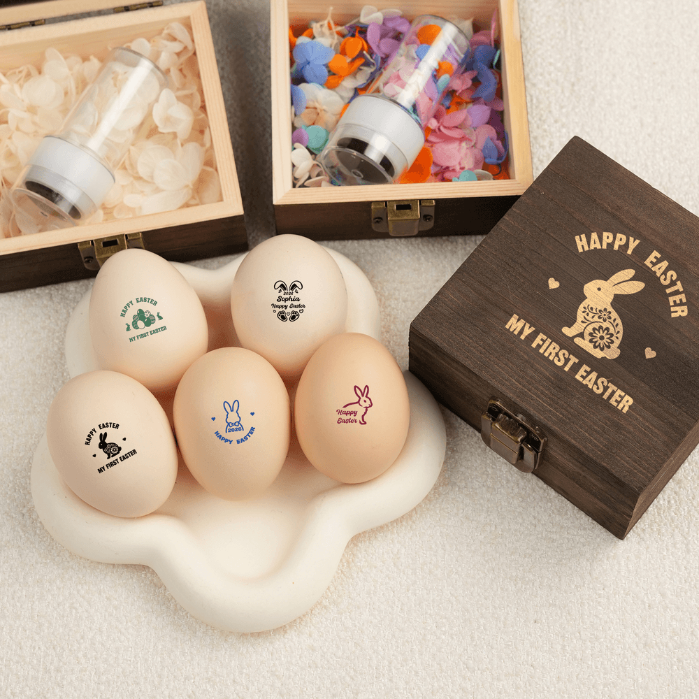 Personlig påskäggsstämpel med flera mönster, namn och trälåda Födelsedagspresent till familjer, jordbrukare och uppfödare