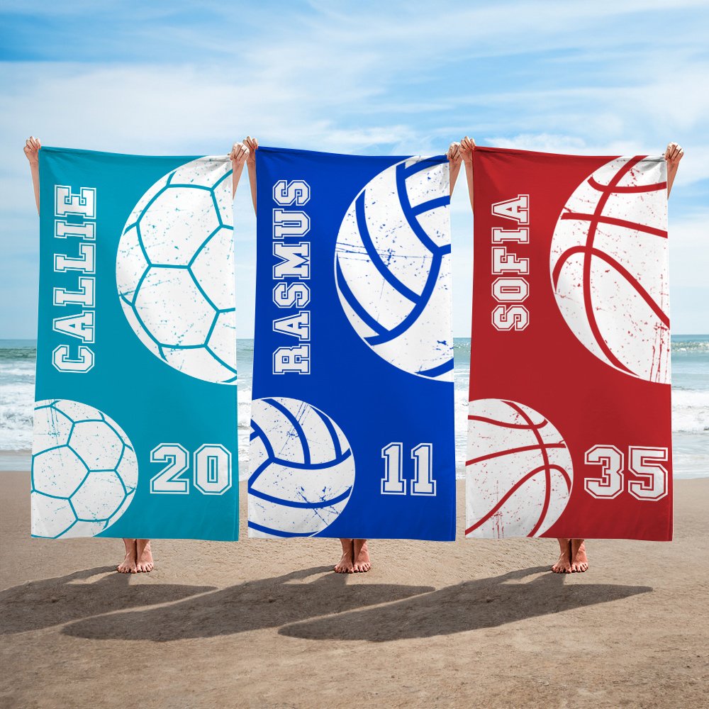 Strandhandduken har ett tryck inspirerat av 22 olika bollsporter, inklusive basket, fotboll, softball och baseboll. Välj bland 23 färger och anpassa med namn och nummer.