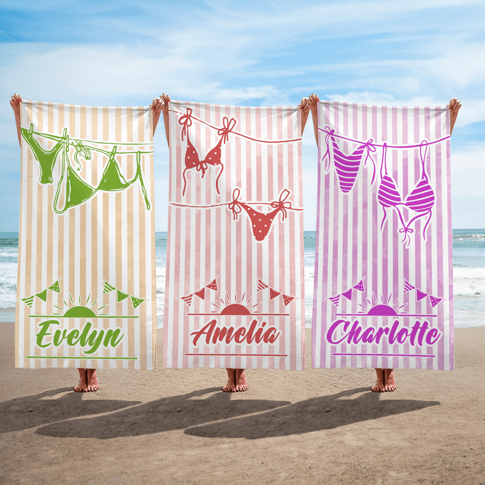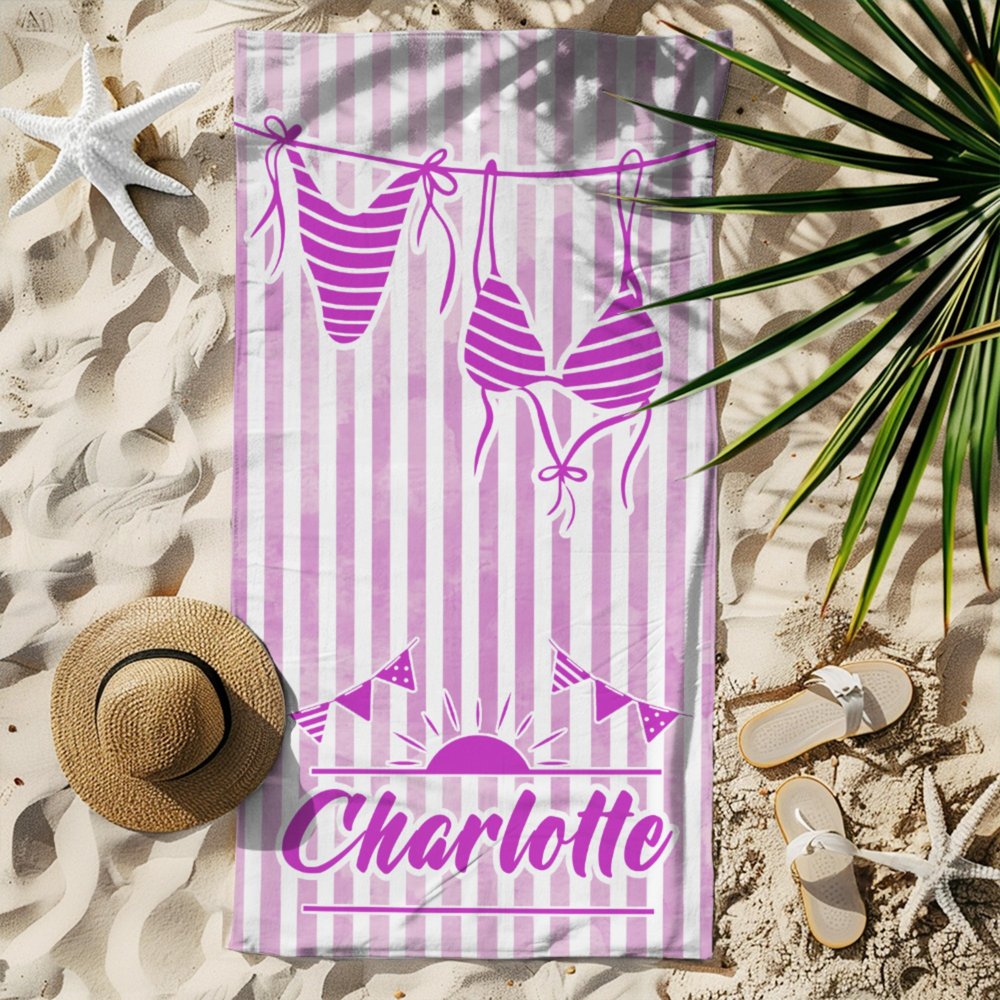 Du kan skapa en unik strandhandduk genom att välja ett färgschema med livliga ränder som beige, rosa eller lila, välja en matchande bikinidesign att hänga på den illustrerade klädstrecket och lägga till ett eget namn i ett lekfullt typsnitt under en solig grafik och bunting. Denna nivå av personalisering förvandlar en enkel handduk till en djärv, rolig hyllning som firar din unika stil och kärlek till sommaren, vilket gör att varje stranddag känns som en personlig semester.