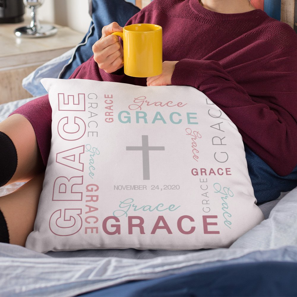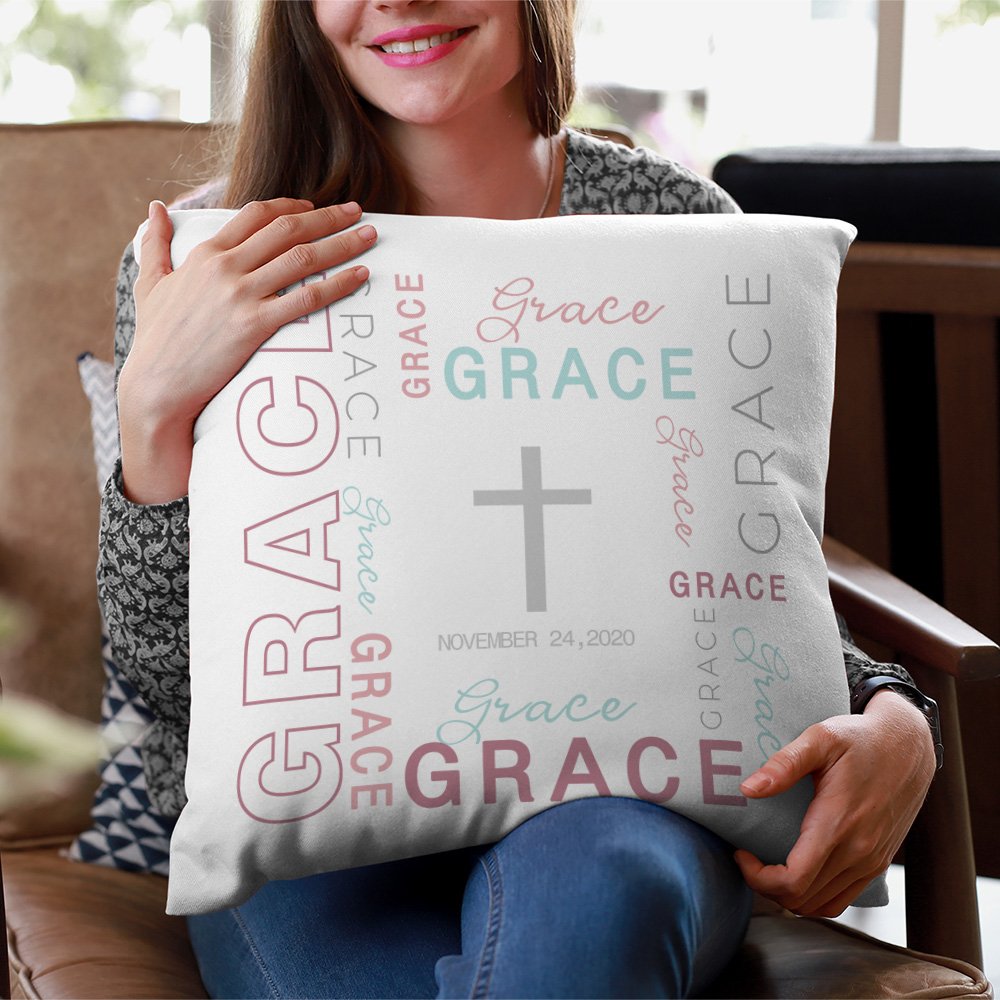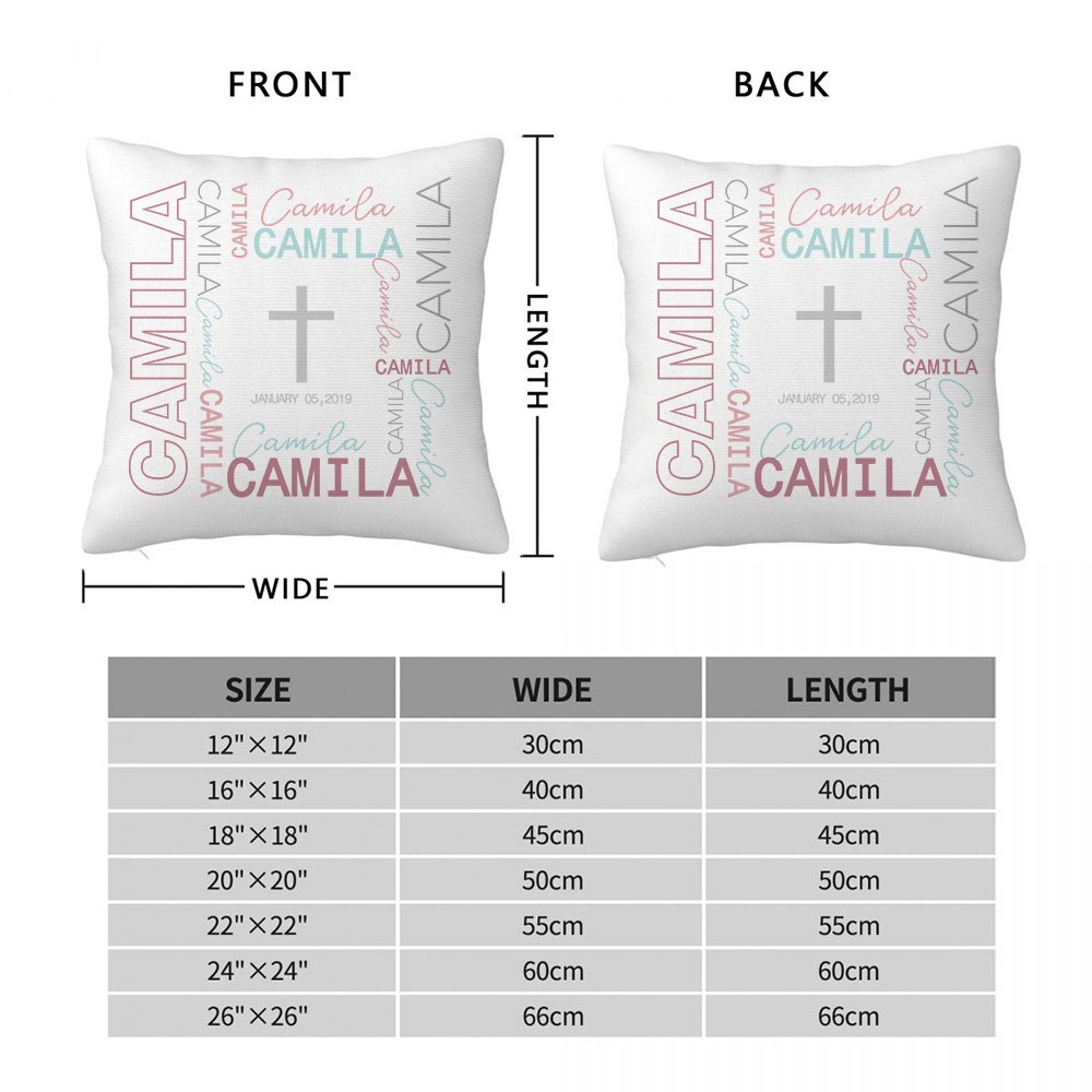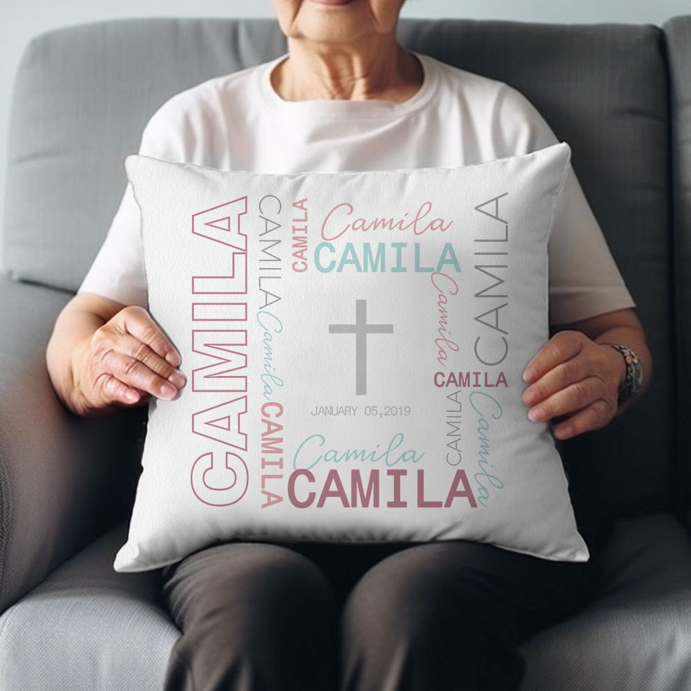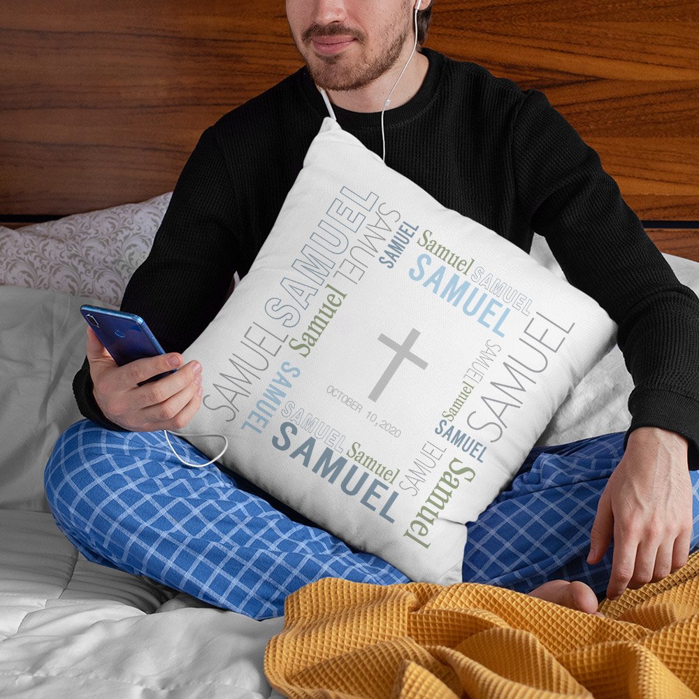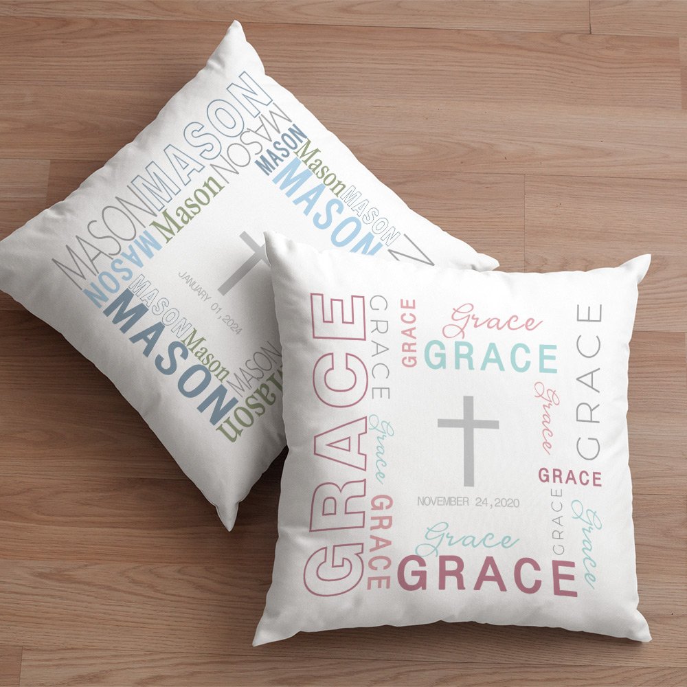 Detta kuddfodral är utformat för att fira en babyshower, födsel eller familjeträff. Mittpunkten är ett kors omgivet av barnets namn, vilket skapar en välkomnande atmosfär. Kuddfodralet finns i två huvudfärger, blått och rött, och du kan också lägga till datumet för att fira denna speciella dag.
