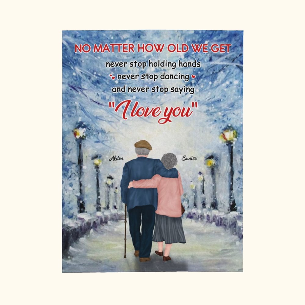 The "No Matter How Old We Get Never Stop Holding Hands" quote celebrates the unbreakable love you share with your lover. Make this romantic love last forever by printing romantic quotes on the blanket and customizing it with your names.