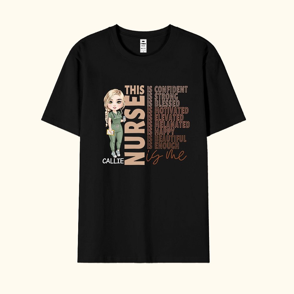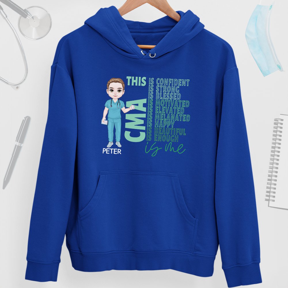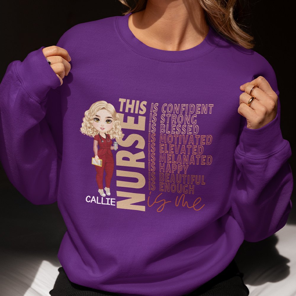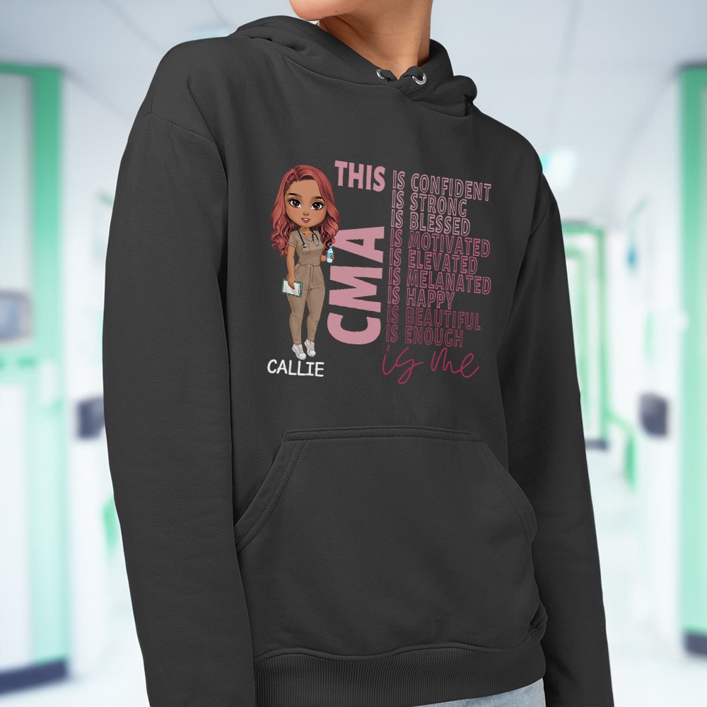 Denna personliga klädsel har ett stärkande budskap för sjukvårdspersonal: "Självsäker, stark, välsignad, motiverad, upphöjd, melaniserad, lycklig, vacker, tillräcklig." Den inspirerande texten kompletteras av en anpassningsbar seriefigur som representerar medicinsk personal. Den här designen hyllar deras styrka, motståndskraft och skönhet och erkänner deras ovärderliga bidrag till samhället.