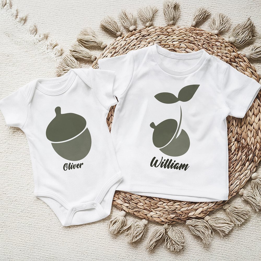 Det här vackra setet föreställer en betydelsefull ek och ett ekollon som symboliserar den djupa kärleken och bandet mellan en far och hans barn. Eken representerar styrka och visdom, medan det växande ekollonet symboliserar tillväxt och samhörighet. Den här designen är perfekt för en familj med två barn och berättar vackert en historia om kärlek, arv och enighet. Samtidigt gör möjligheten att anpassa med namn det till ett unikt modeplagg.