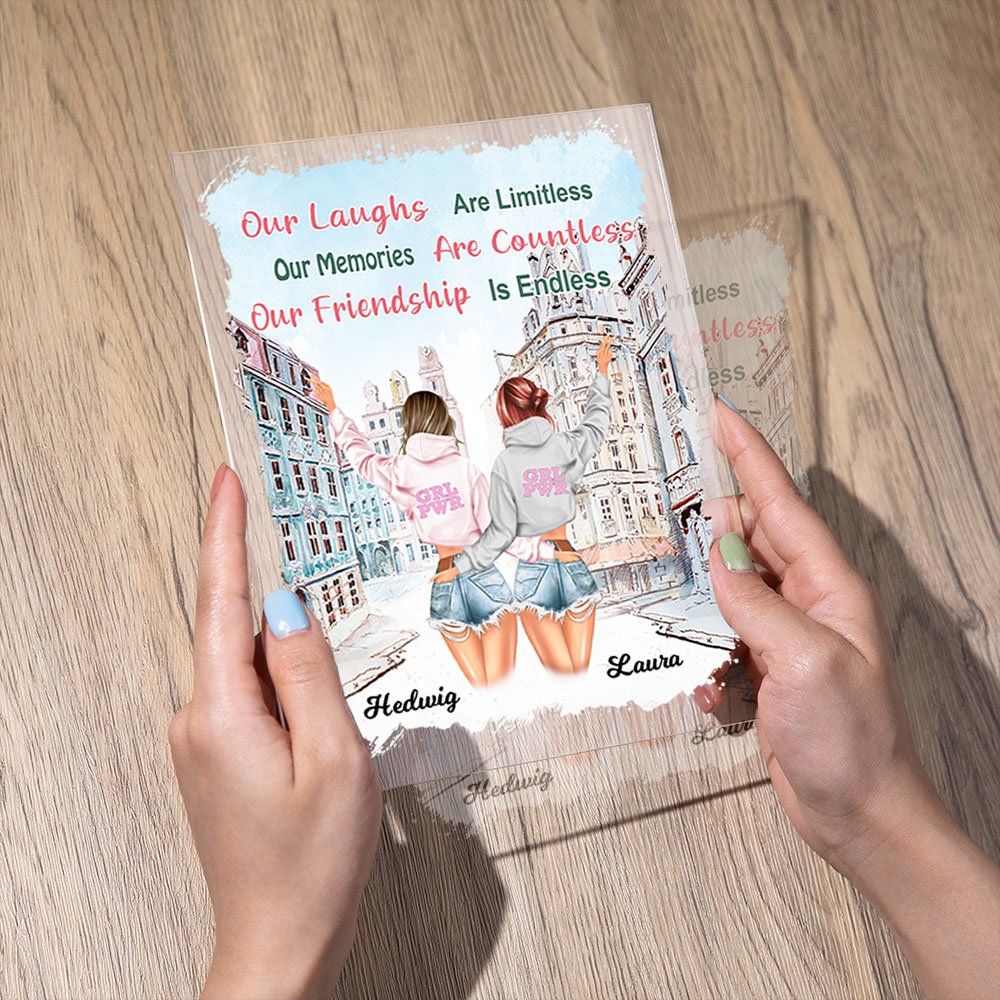 This acrylic plaque is the perfect gift for your best friend as it can be customized with your and your friend's name and appearance, adding a personal touch to the gift.