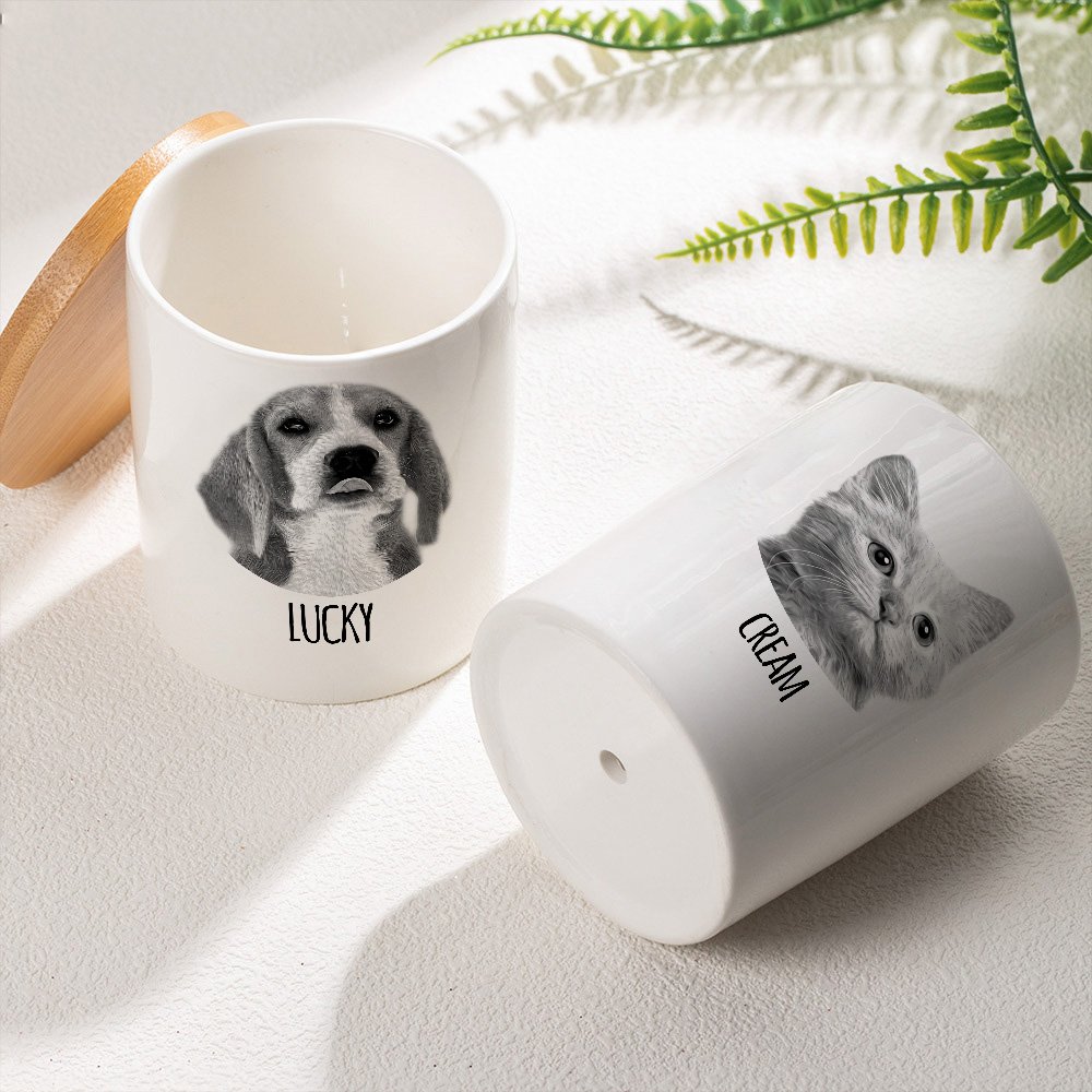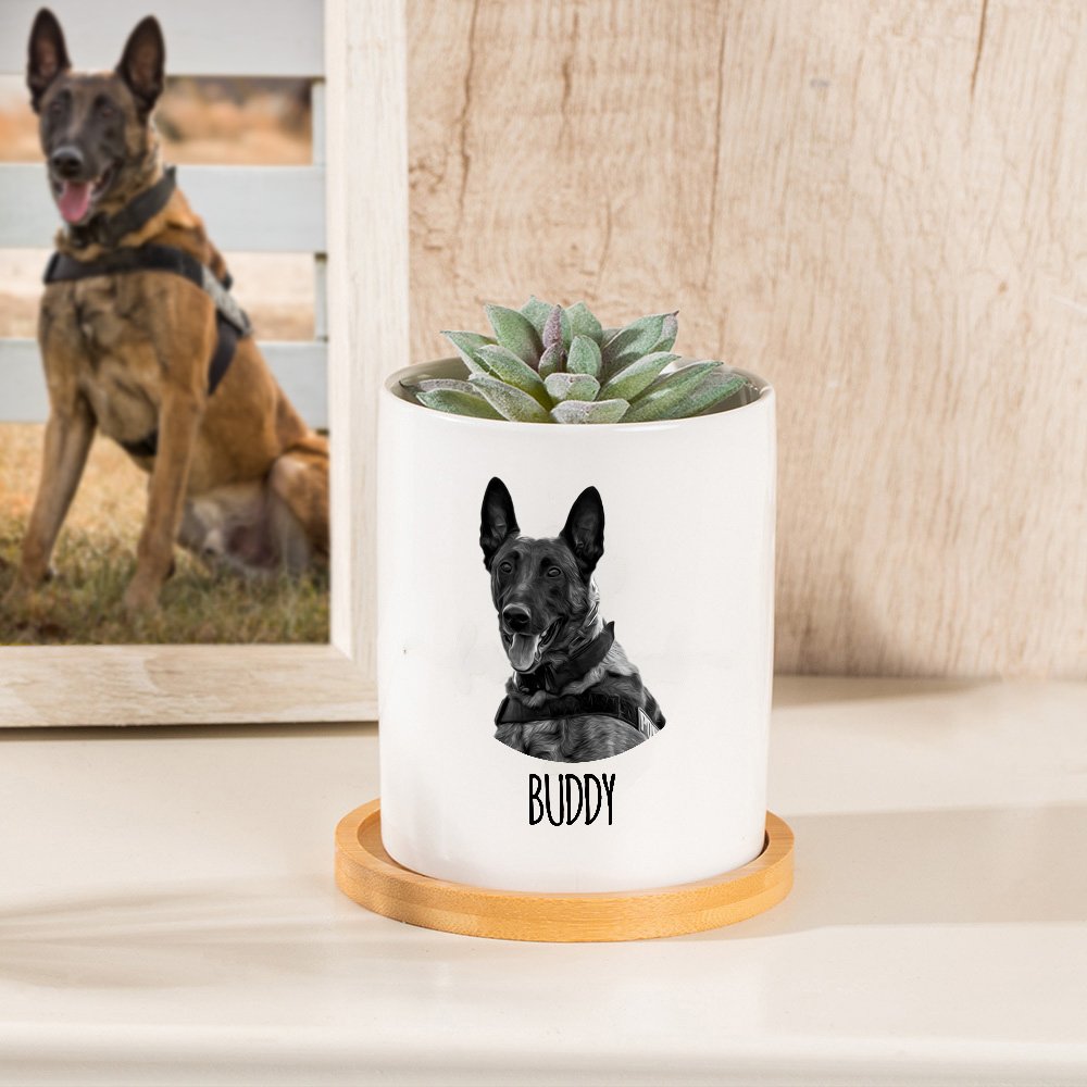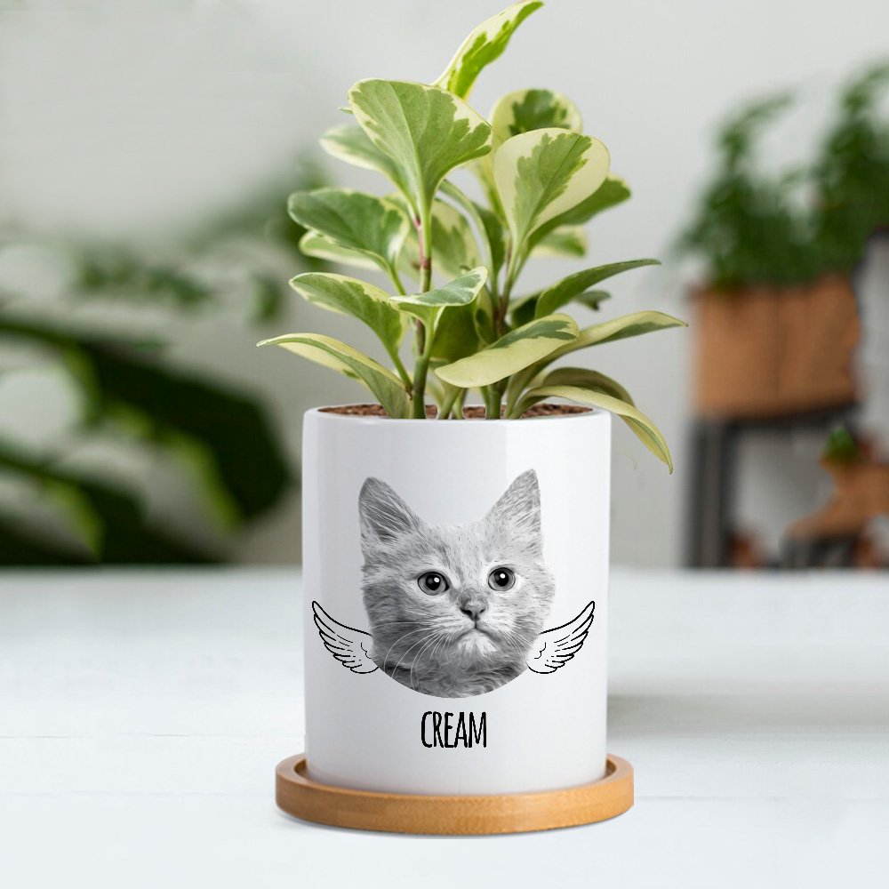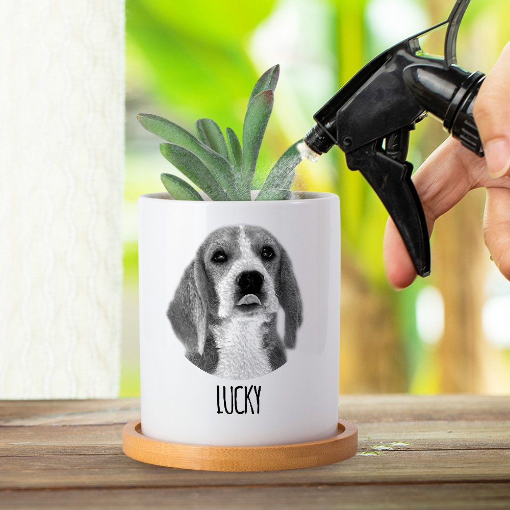 Hedra ditt älskade husdjur med en personlig växtkruka med ett porträtt och ett namn. Välj en högkvalitativ bild för att fånga sötheten, vilket gör det till en hjärtlig hyllning till din håriga vän.