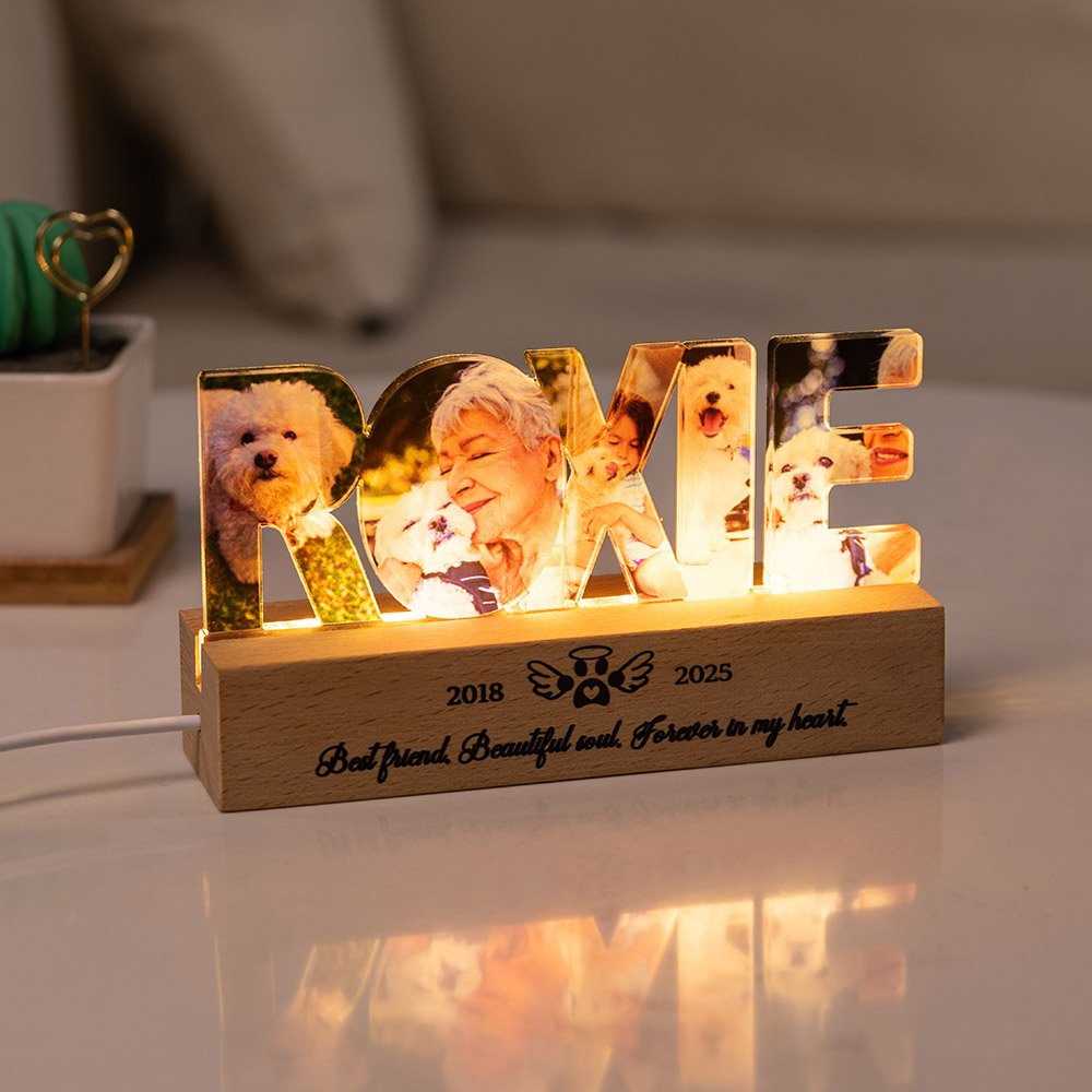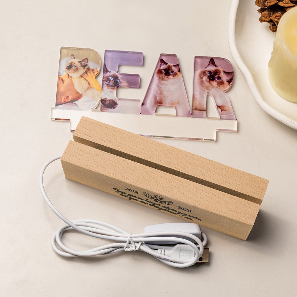 Denna nattlampa använder mjuk, varm LED-belysning i kombination med ett klart fototryck på akryl för att visa upp ditt husdjurs sötma till fullo. Den tjocka träbasen med släta kanter står stadigt på skrivbordet eller nattduksbordet.