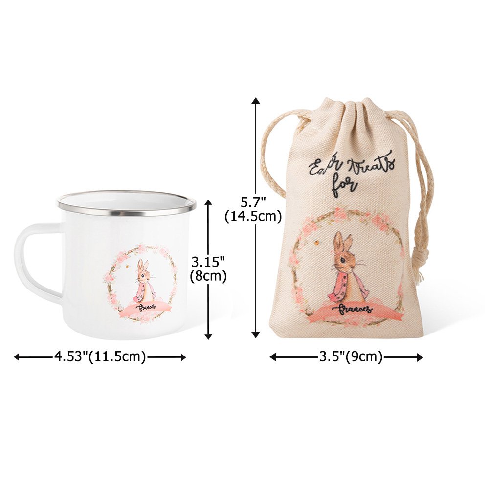 Gör påsken extra speciell med denna presentuppsättning av en emaljerad mugg med kanin och en godispåse. Den charmiga designen föreställer Peters kanin och färgglada blommor och fångar omedelbart barnens hjärtan.