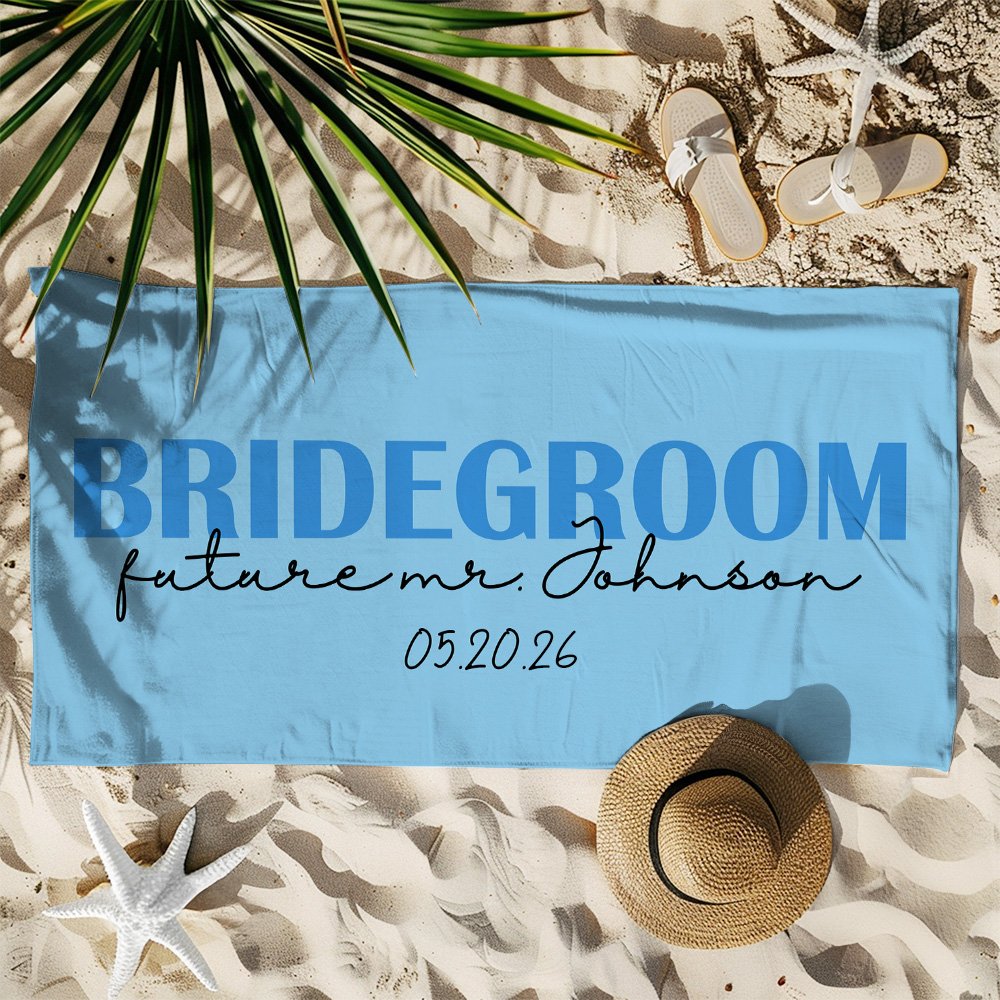 Denna strandhandduk har en speciell design med texten "Bride" eller "Bridegroom", som kan anpassas med ditt unika efternamn och bröllopsdatum. Detta gör den till en unik minnessak som fångar andan av svensexan och möhippan, perfekt för att fira kärlek och minnesvärda ögonblick.