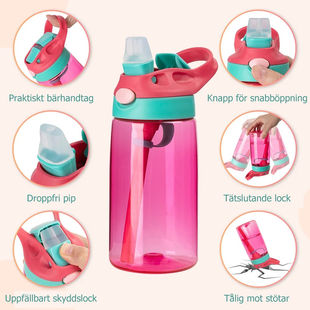 Det mjuka silikonsugröret gör flaskan lätt att dricka ur, och den breda öppningen gör påfyllning snabb och enkel. Det säkra locket förhindrar läckage, och det robusta handtaget är perfekt anpassat för små händer.