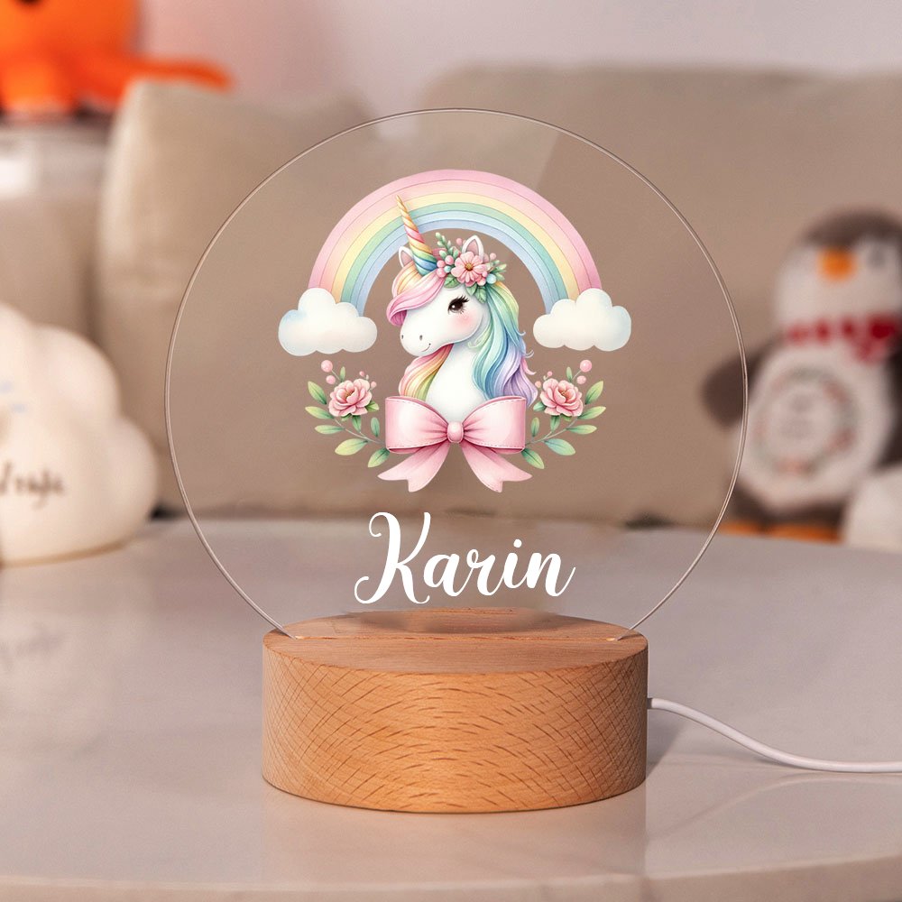 Tänd denna nattlampa och för in sagovärldens magi i ditt barns rum. Designen, inspirerad av drömska enhörningar och vackra regnbågsblommor, står på en elegant bas av naturligt bokträ. Den lekfulla och samtidigt stiliga designen passar perfekt i alla barnrum och kan enkelt anpassas med barnets namn för att göra lampan ännu mer exklusiv och personlig.