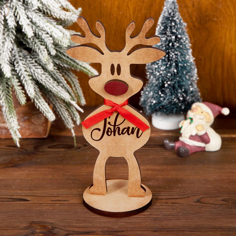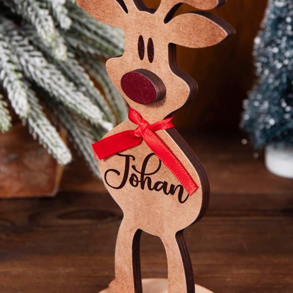 Den bedårande renen med en söt röd nos och en festlig rosett ger din juldekoration en lekfull och mysig touch. Den rustika designen gör den till en perfekt detalj i alla hem under julsäsongen och kan dessutom anpassas med namn för att skapa en personlig och meningsfull julminne.