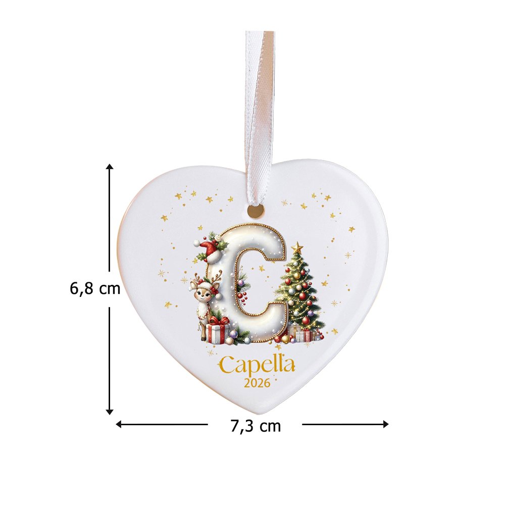 Denna vackert utformade keramikprydnad visar den festliga julinitialen prydd med söta renar och en julgran, du kan anpassa den med ditt namn och år, vilket gör denna prydnad till en meningsfull representation av högtiden.