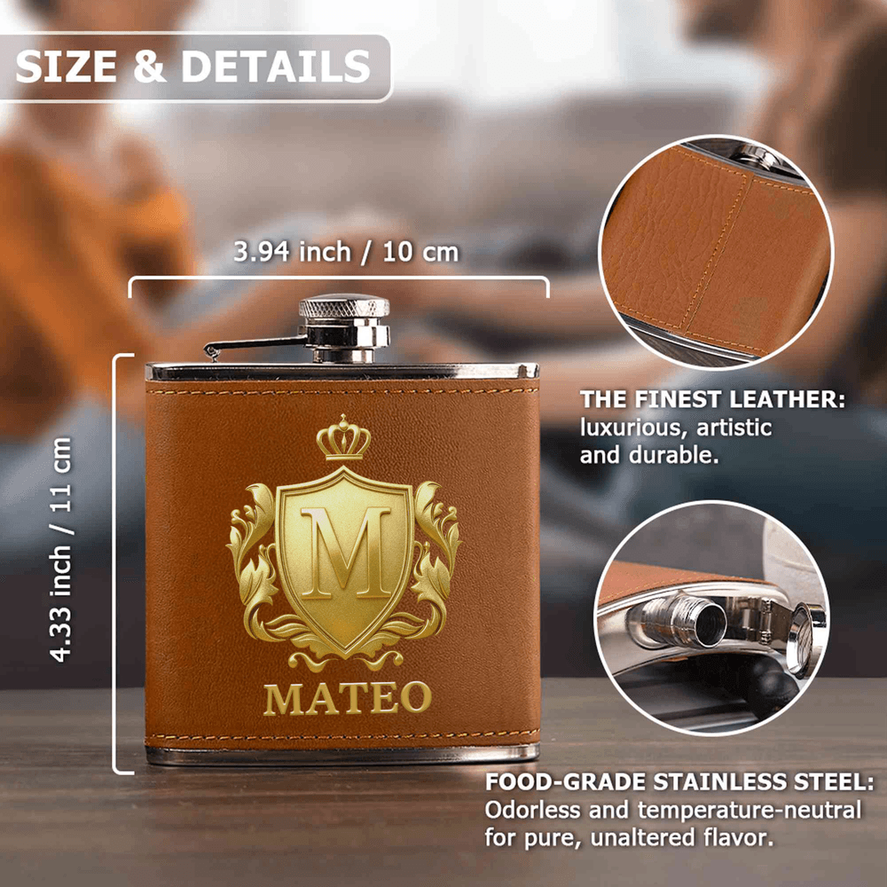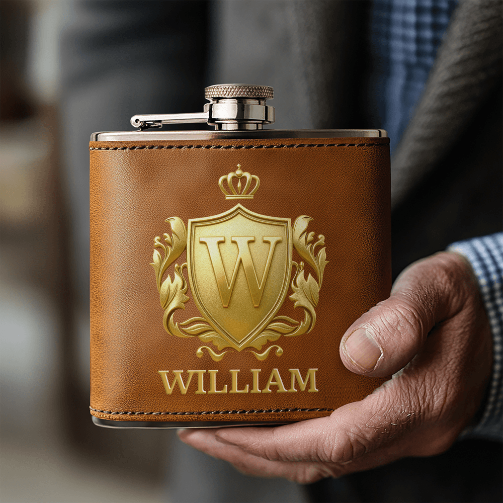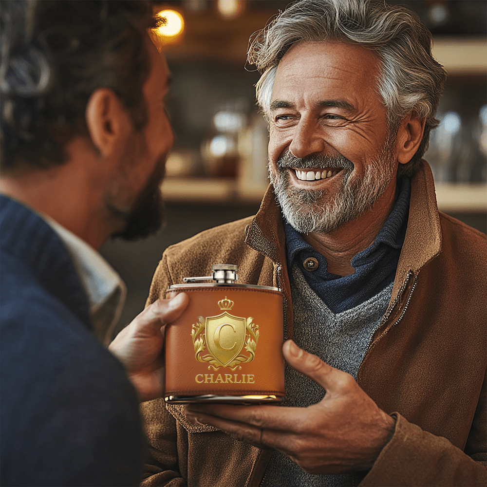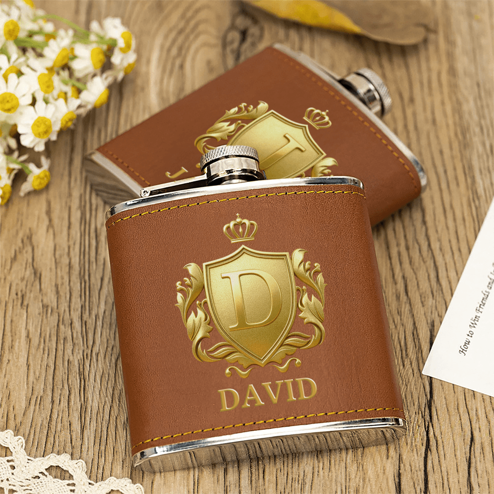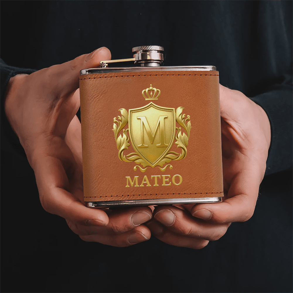 Höftflaskan är omsorgsfullt inslagen i premiumläder, med ett anpassningsbart 3D-präglat monogram på ytan och givarens innerliga avsikter på det släta, smidiga lädret. Den behåller äventyrets vintageanda samtidigt som den införlivar modern minimalistisk estetik, och varje detalj utstrålar värmen från hantverksmässigt handarbete.