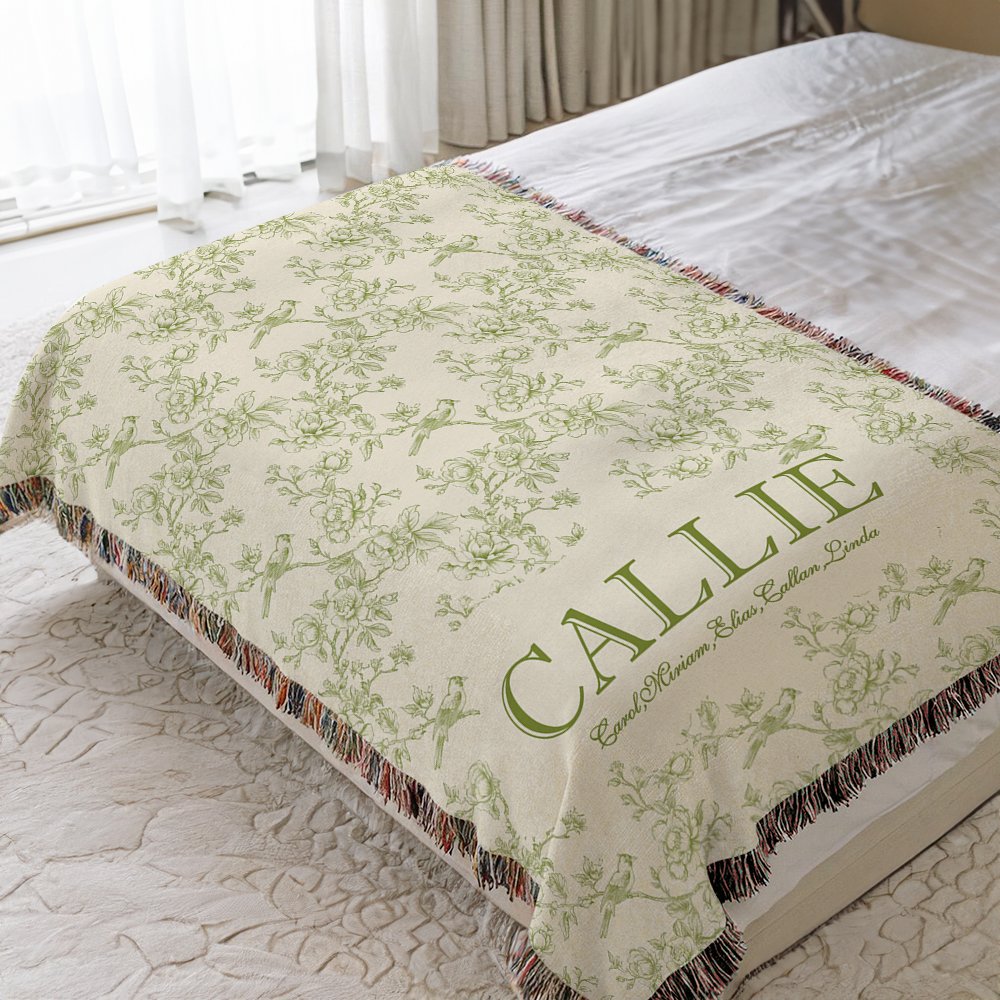 Denna design är fylld av blommor och fågelblommor och blandar vintage charm med naturlig skönhet. Oavsett om den är utspridd eller upphängd ger den en elegant atmosfär och blir ett framträdande inslag i vardagsrum eller sovrum. Gör den personlig med en speciell titel eller ett namn för att ge den en minnesvärd betydelse och förvandla ett praktiskt föremål till en unikt dekorativ bit.