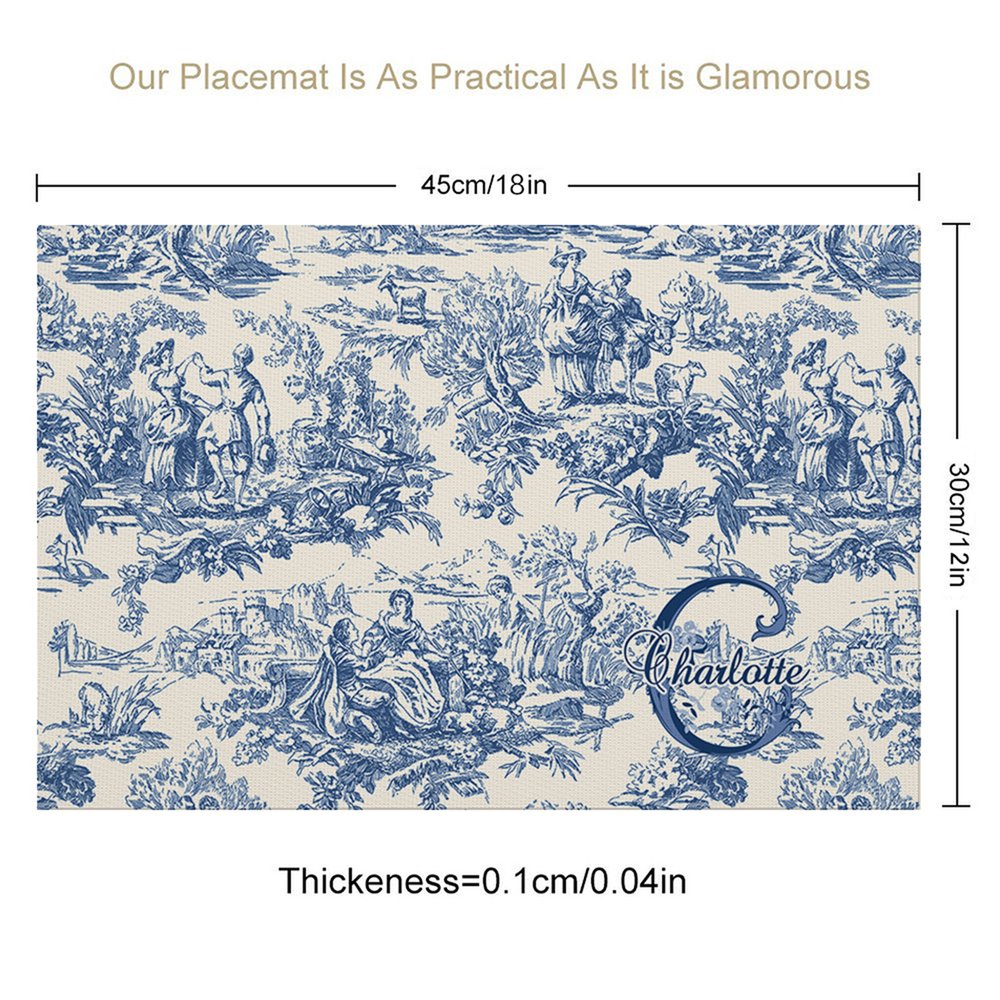 Dessa Toile de Jouy vintage-placemats är inspirerade av fransk lantlig stil och kombinerar på ett smart sätt romantisk elegans med personalisering. Anpassa med ditt favorittryck och din favoritfärg, tillsammans med dina initialer och namn, för att omedelbart förvandla din bordsskiva till en unik stil och lägga till en touch av avslappnad fransk livsstil till din dagliga middag eller arbetsdag. "Enjoy elegant living" och gör varje måltid till en raffinerad matupplevelse.