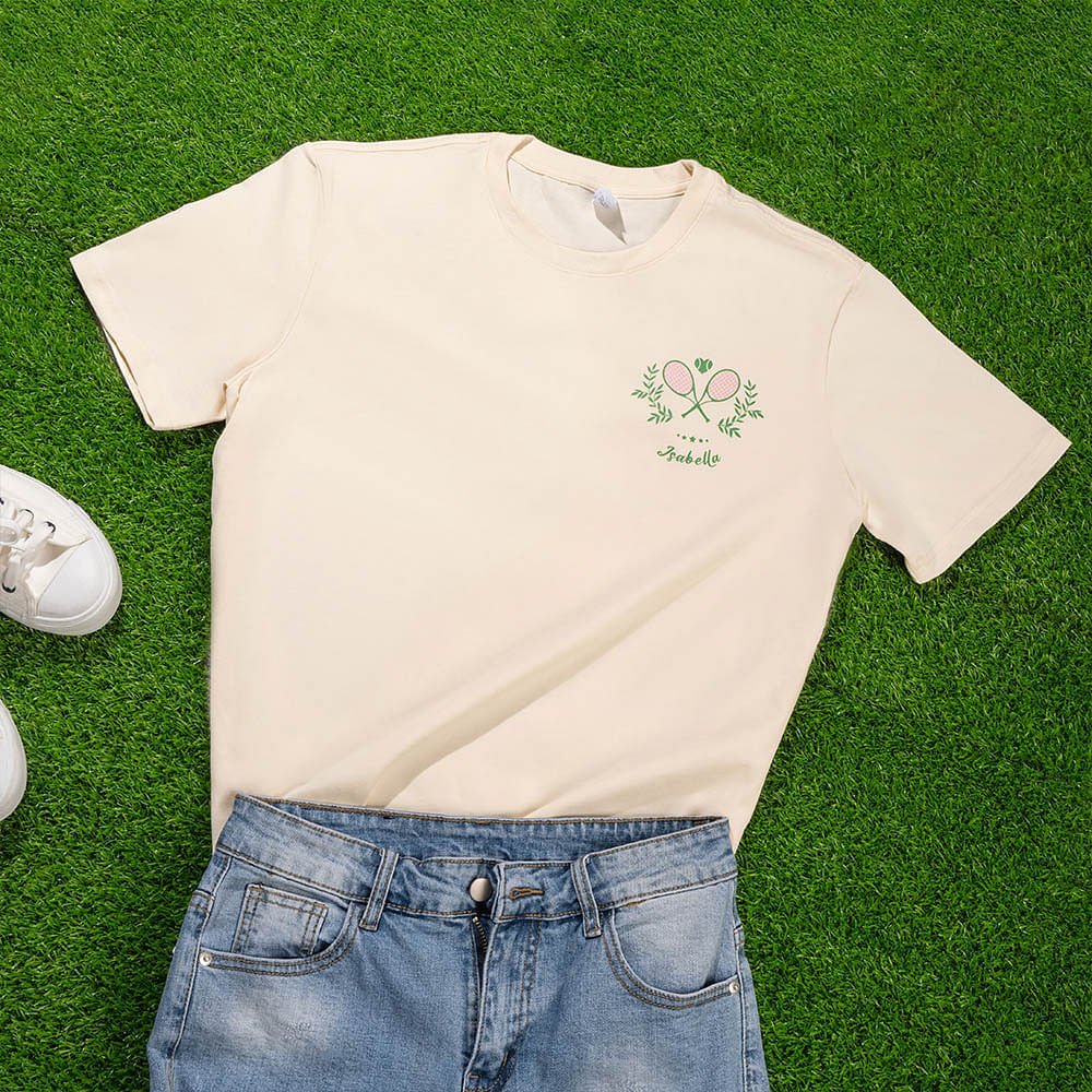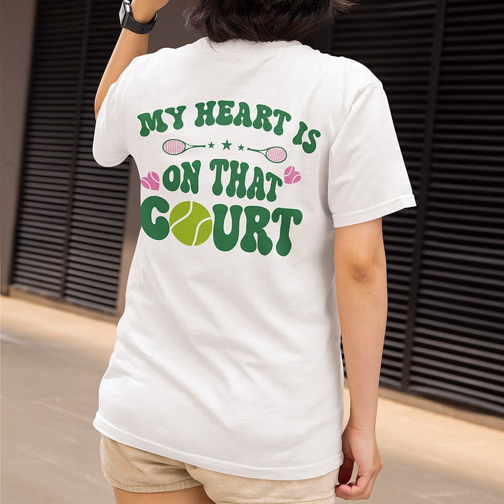 This tennis racket set features a customizable name combination on the left front chest, adding a personalized touch. "MY HEART IS ON THAT COURT" is printed on the back, making it a unique and fashionable choice for tennis lovers.