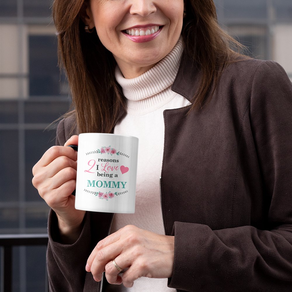 The heartfelt inscription "Reasons I Love Being a Mommy" imprinted on the mug, not only brightens up the day but also serves as a constant reflection of the love and joy of motherhood.