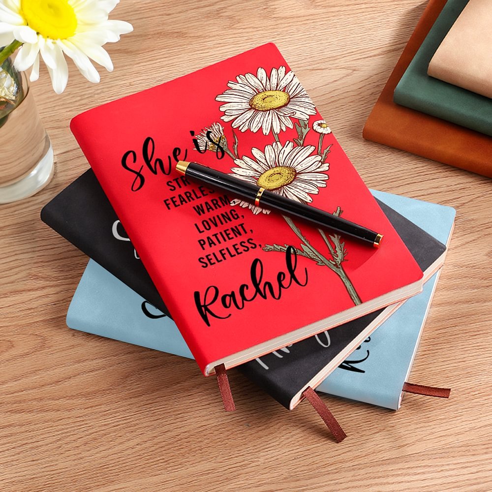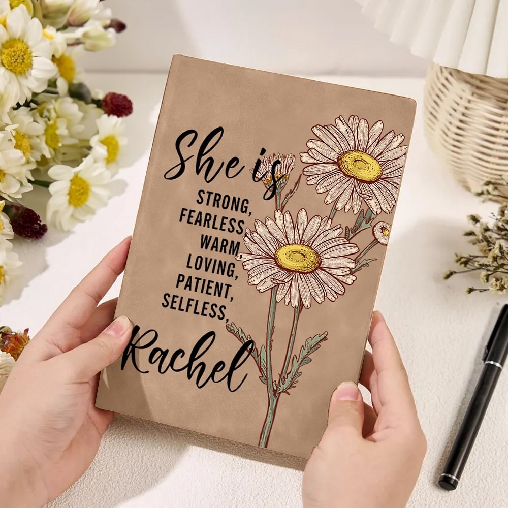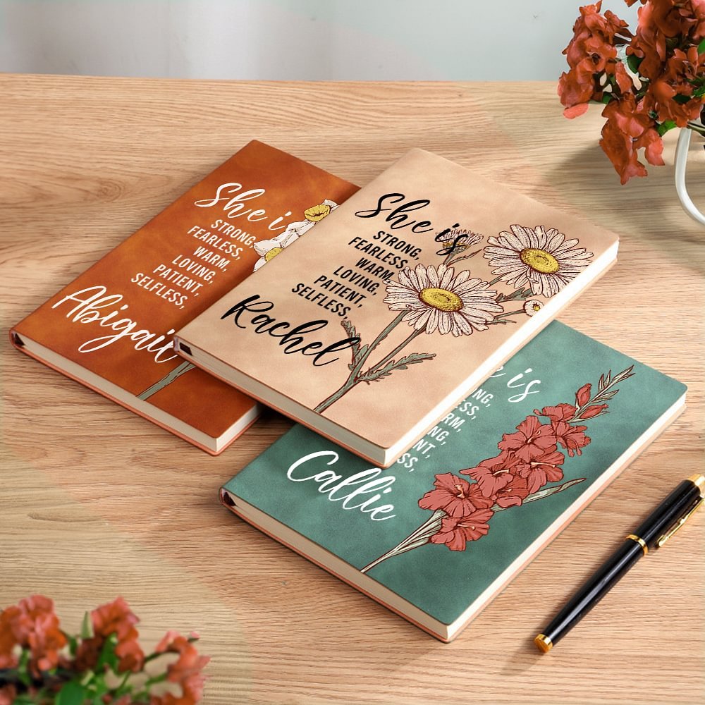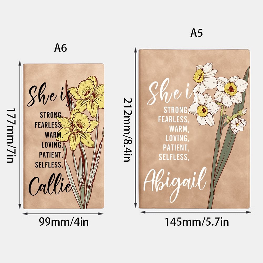 Denna anteckningsbok i A6-format är designad med en elegant födelsedagsblomma och texten "She is STRONG, FEARLESS, WARM, LOVING, PATIENT, SELFLESS", som visar kvinnans vackra egenskaper. Du kan lägga till ditt namn för att skapa en unik studie- eller arbetsbok.