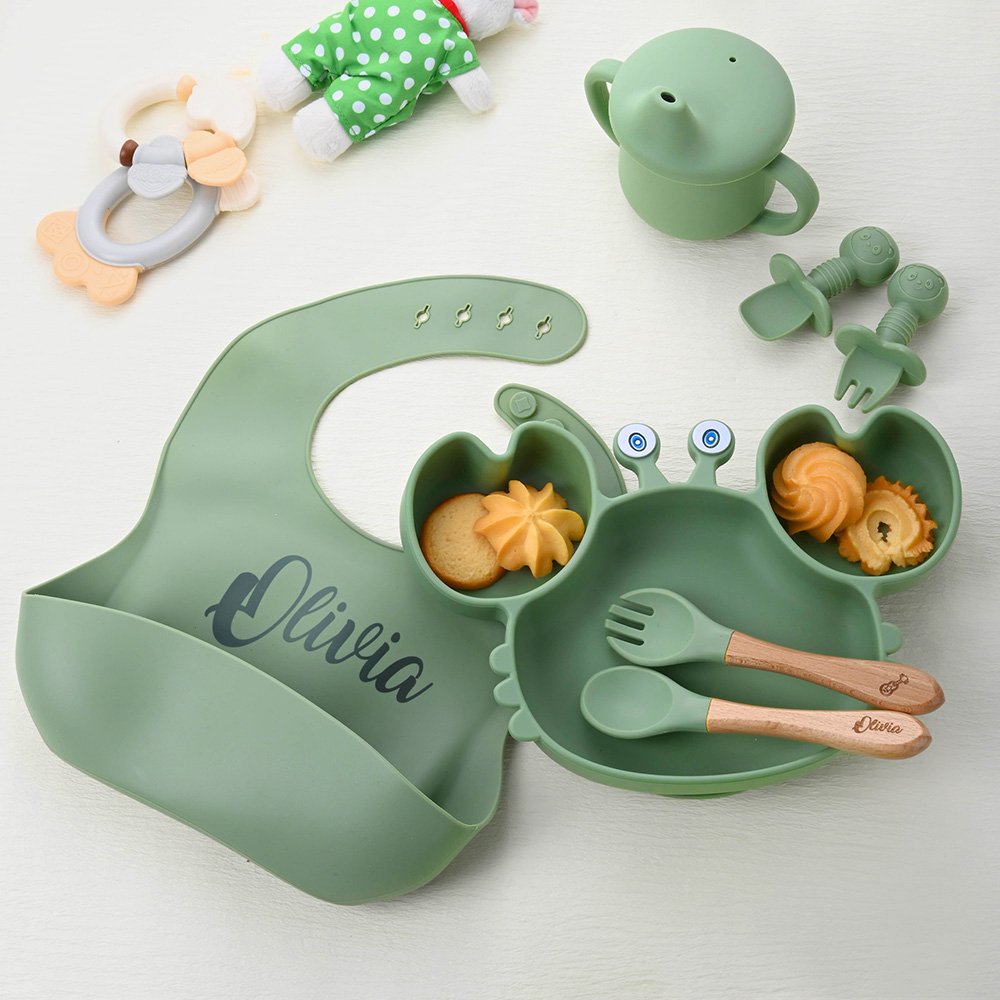 Matningssetet består av en krabbformad delad sugplatta. Den har tre fack för att separera olika typer av mat, vilket gör det lättare för ditt barn att utforska olika smaker och konsistenser. Den sugande basen håller tallriken stadigt på plats på bordet och förhindrar att den välter eller kastas av ditt barn. Dessa tallrikar har ett anpassningsalternativ som gör att du kan göra dem personliga med ditt barns namn eller initialer för en speciell touch.