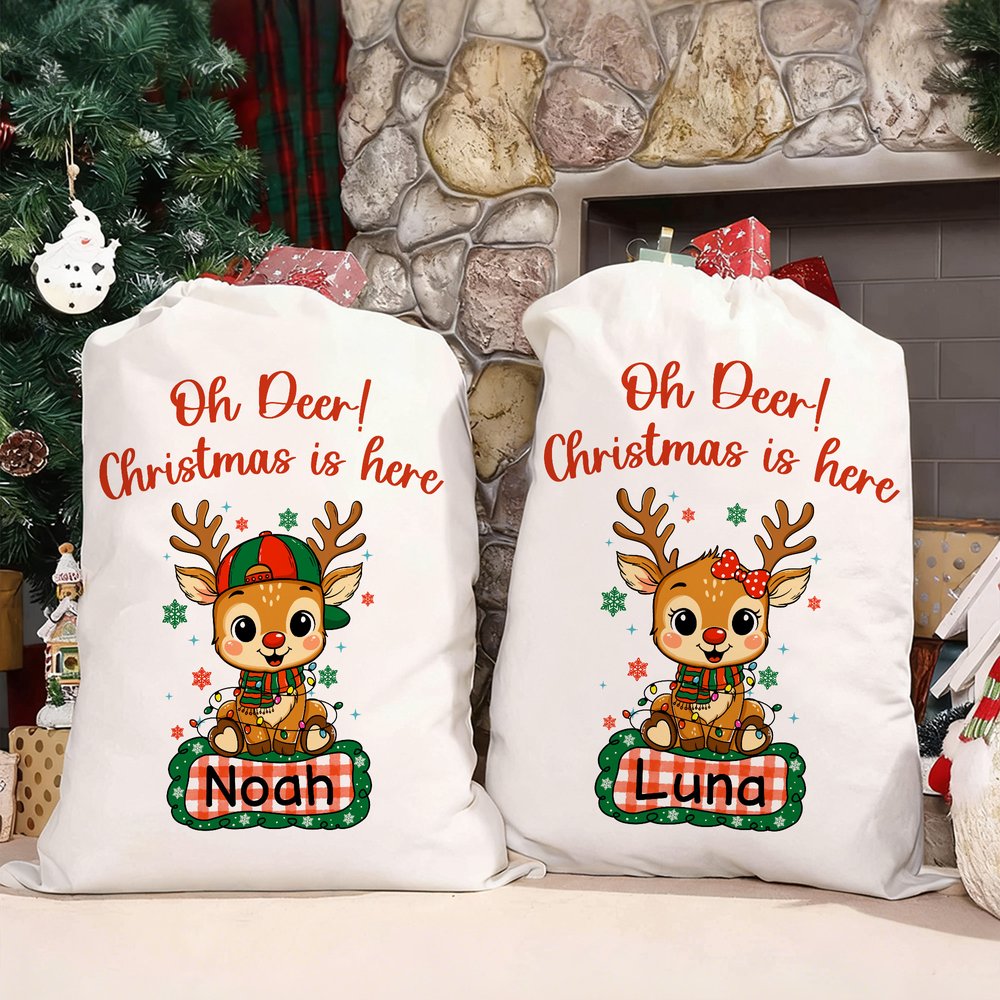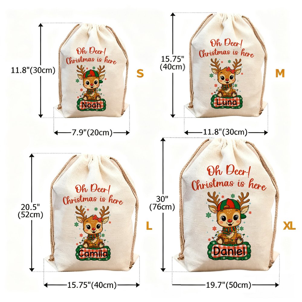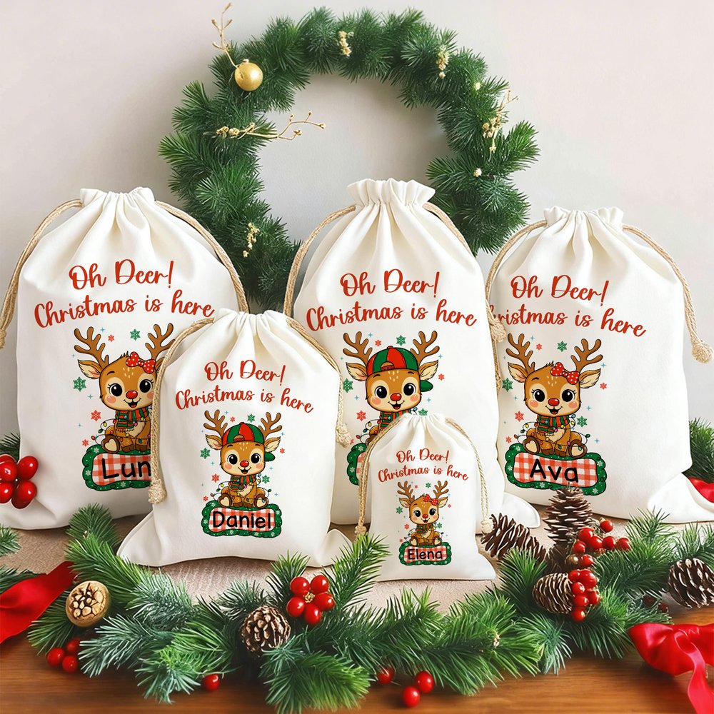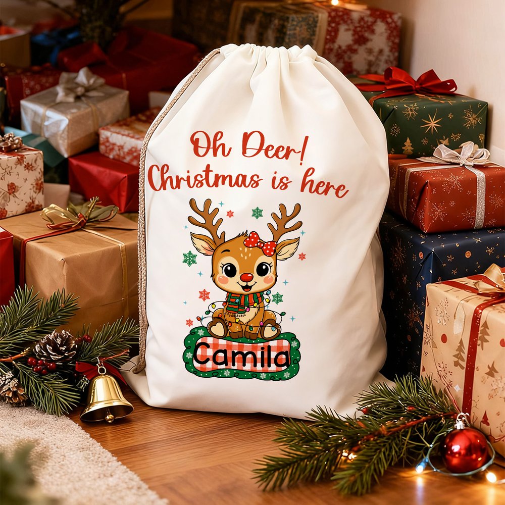 Denna presentpåse har en söt tecknad rendesign prydd med julbelysning, snöflingor och festliga accenter tillsammans med ett eget namn och den lekfulla frasen "Oh Deer! Julen är här." Den är skräddarsydd för barnens smak med ljusa, nyckfulla detaljer och förvandlar en enkel väska till ett unikt minne med jultema.