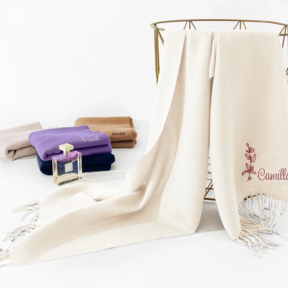 Den här scarfen har en skräddarsydd design med födelseblommor och broderade namn som symboliserar lyckönskningar och personliga uttryck. Födelseblommorna ger ett naturligt inslag, medan det delikata namnbroderiet gör denna scarf ännu mer unik.