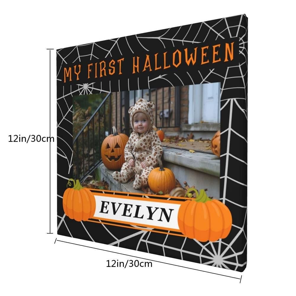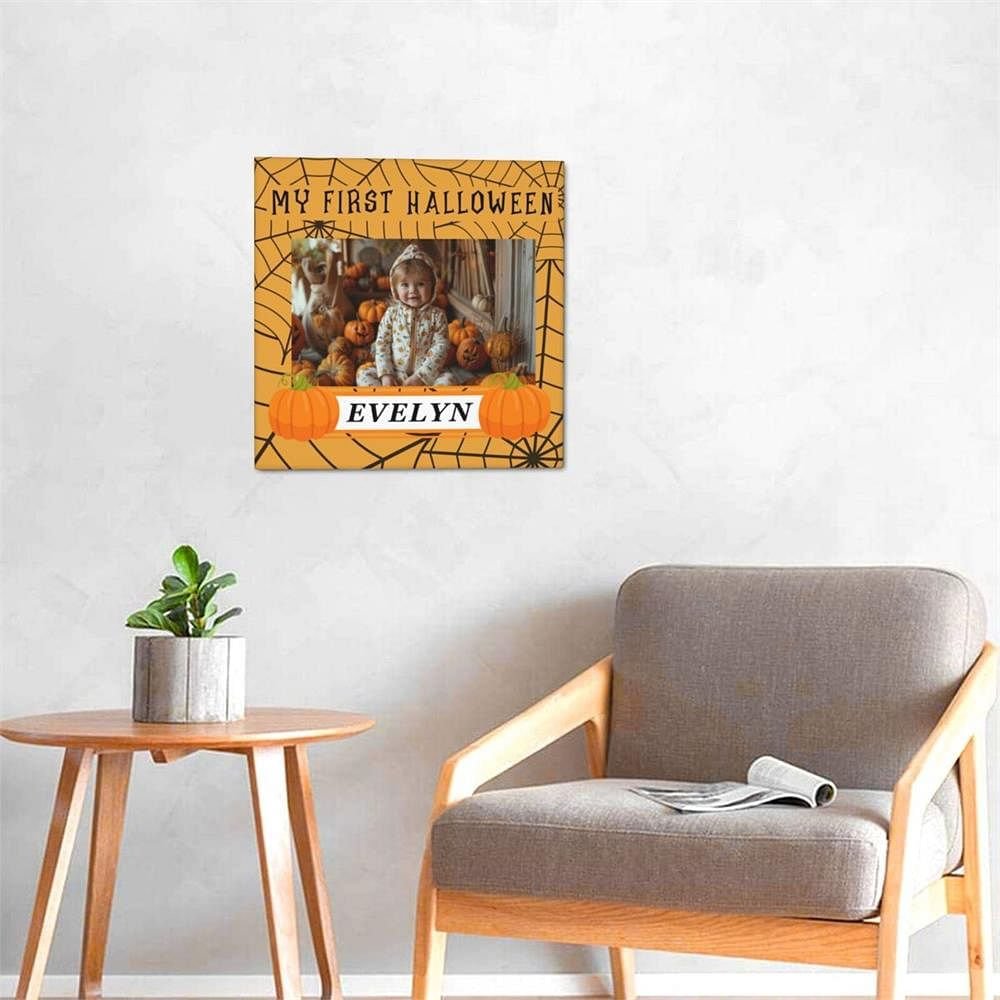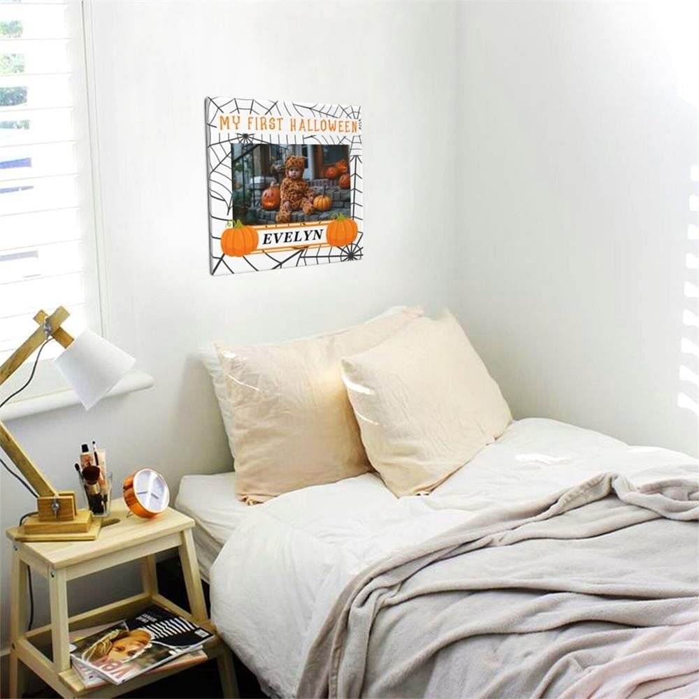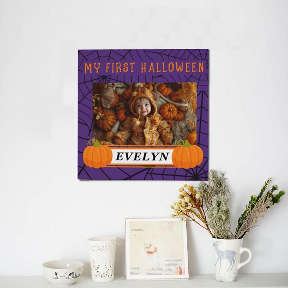 This decorative painting incorporates festive characteristics and personal elements, making the decorative painting unique and of commemorative value. The canvas painting has the text "My First Halloween", you can upload a photo to customize the picture on the canvas painting, you can also customize the name below the photo, and then match the pumpkin and spider web and other details, to create a both appropriate and cute atmosphere.