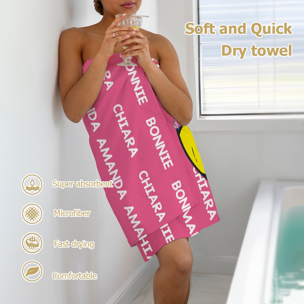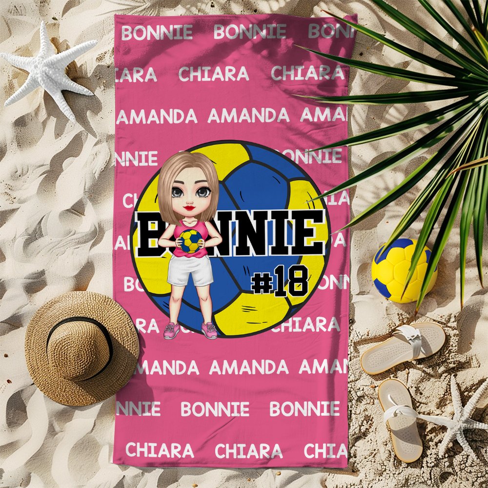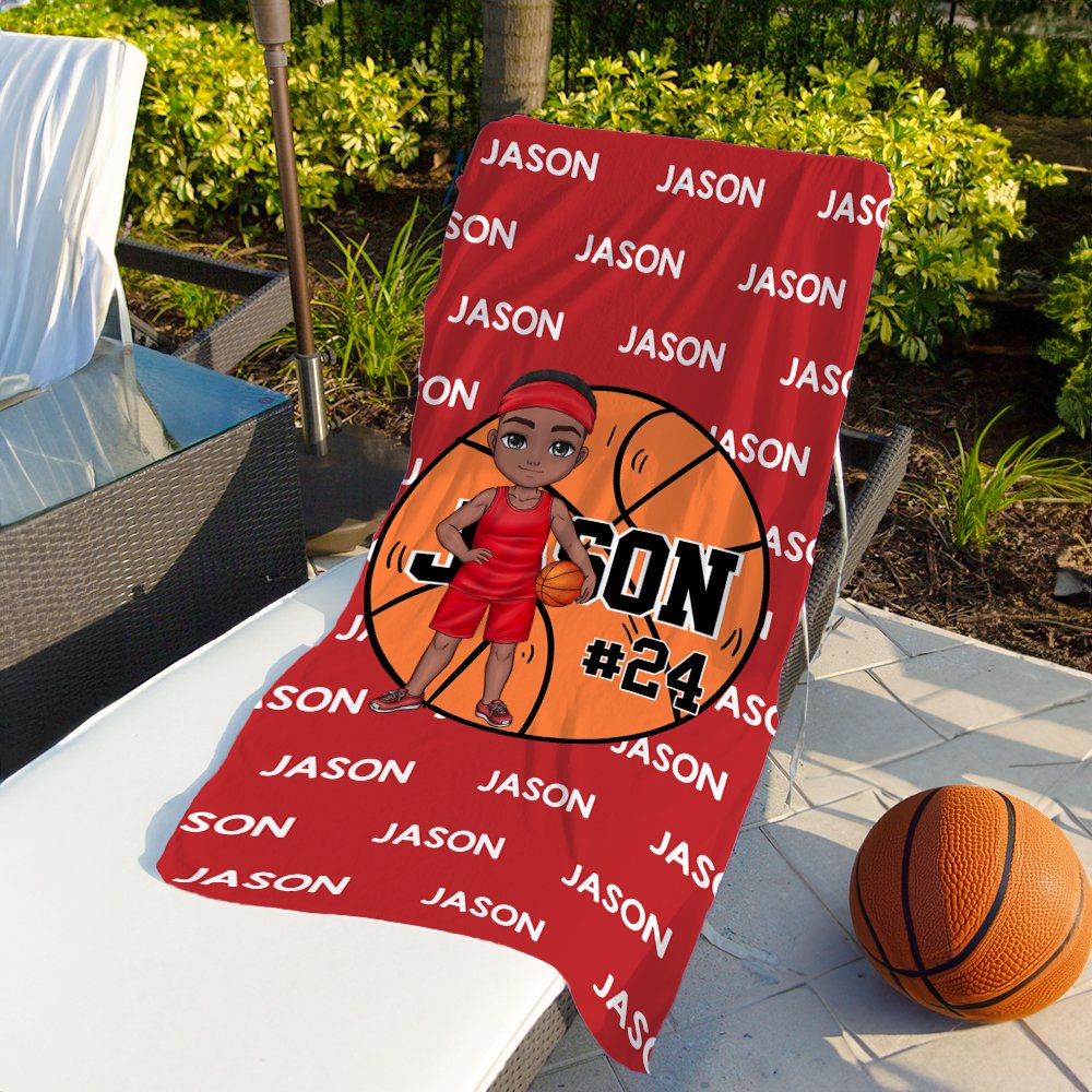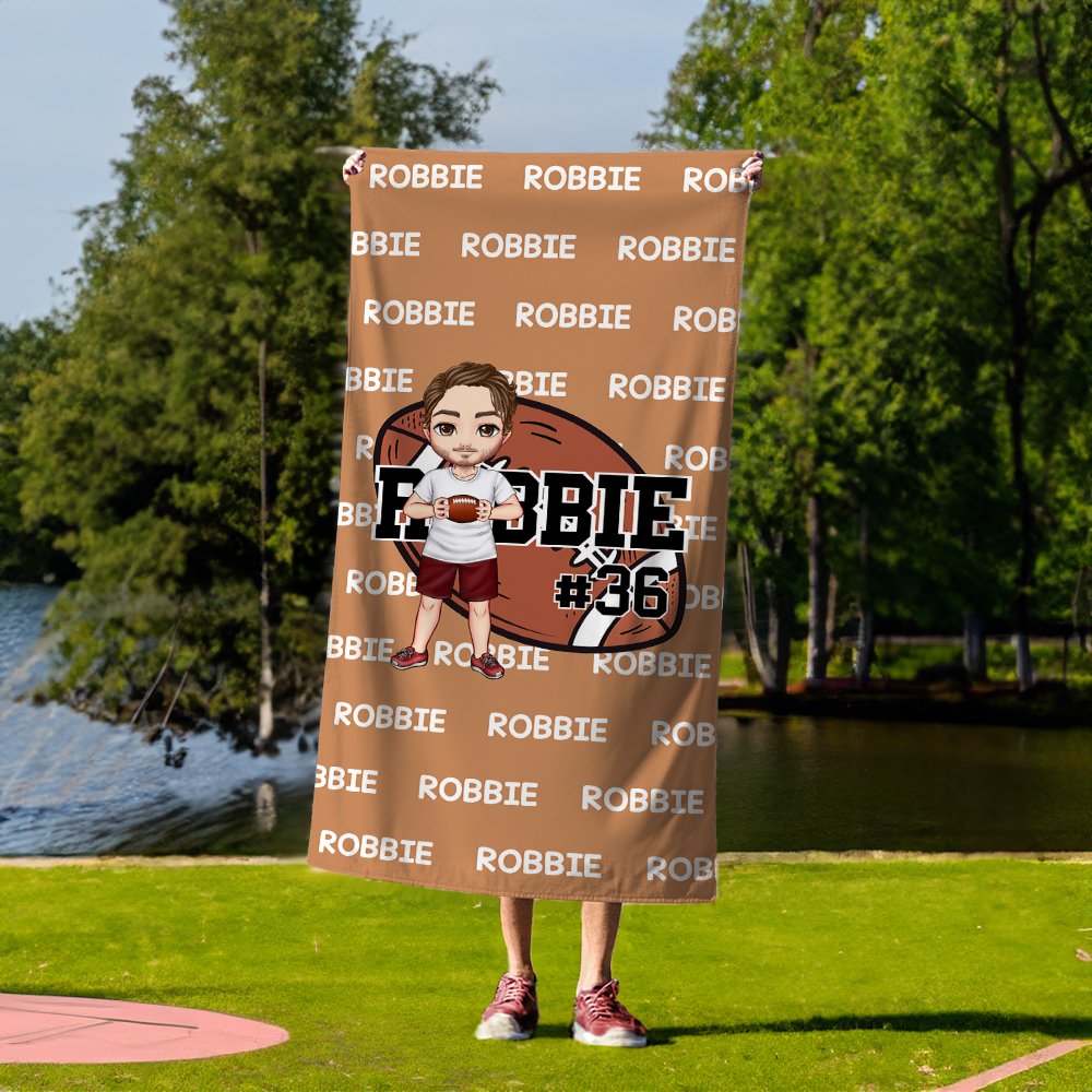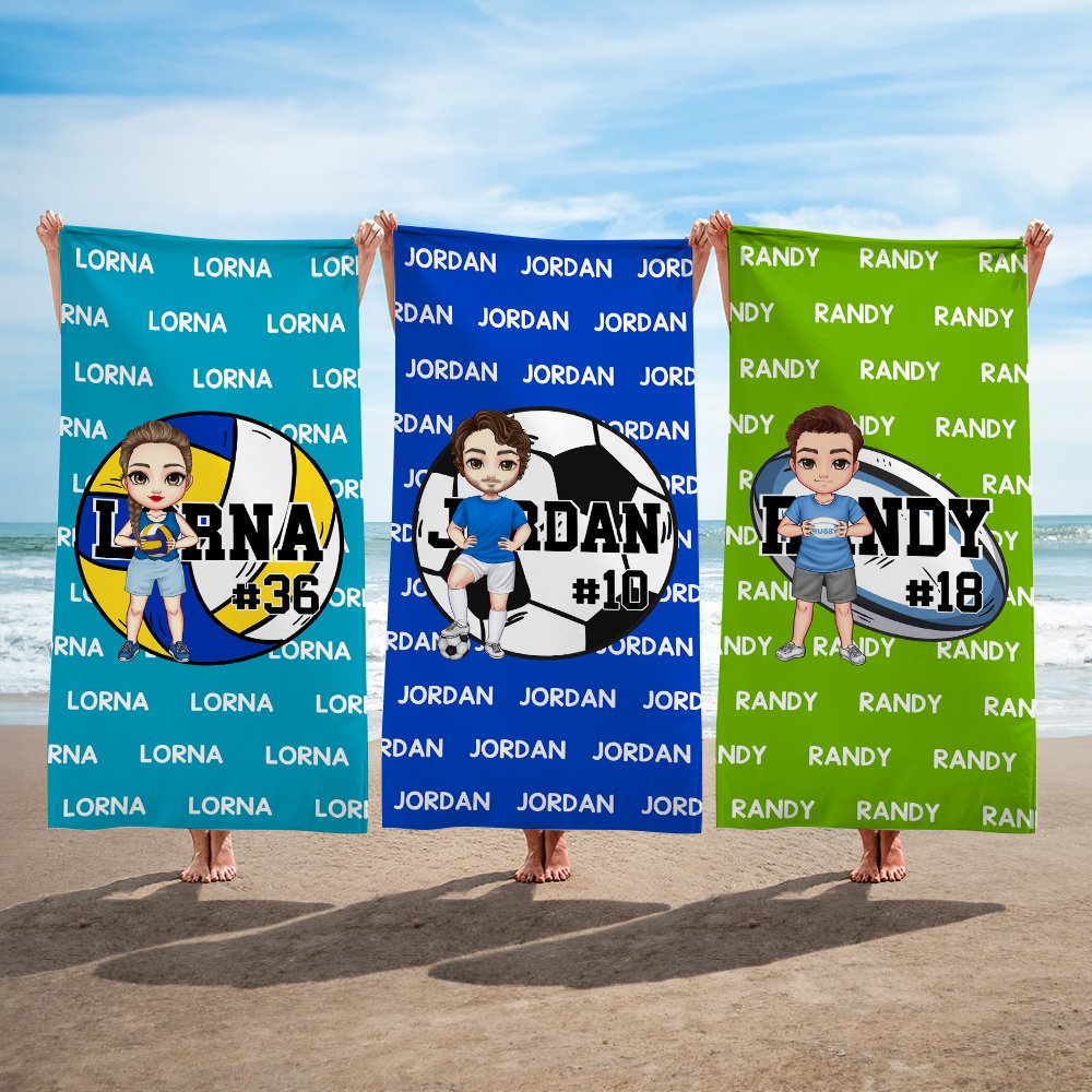 Denna strandhandduk har bollsportelement tillsammans med anpassningsbara tecknade karaktärsdesigner. Du kan designa en unik karaktär online, lägga till ett personligt namn eller nummer och ge den här badhandduken en distinkt personlig charm.