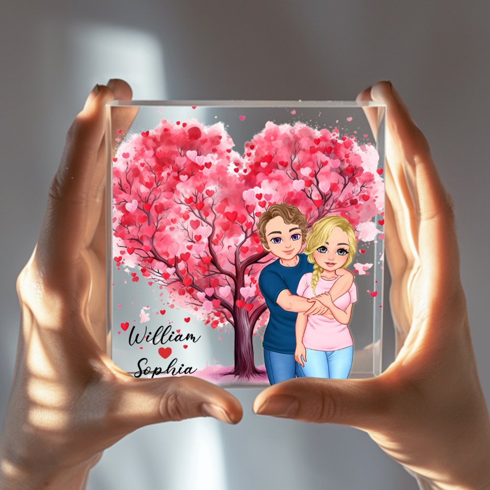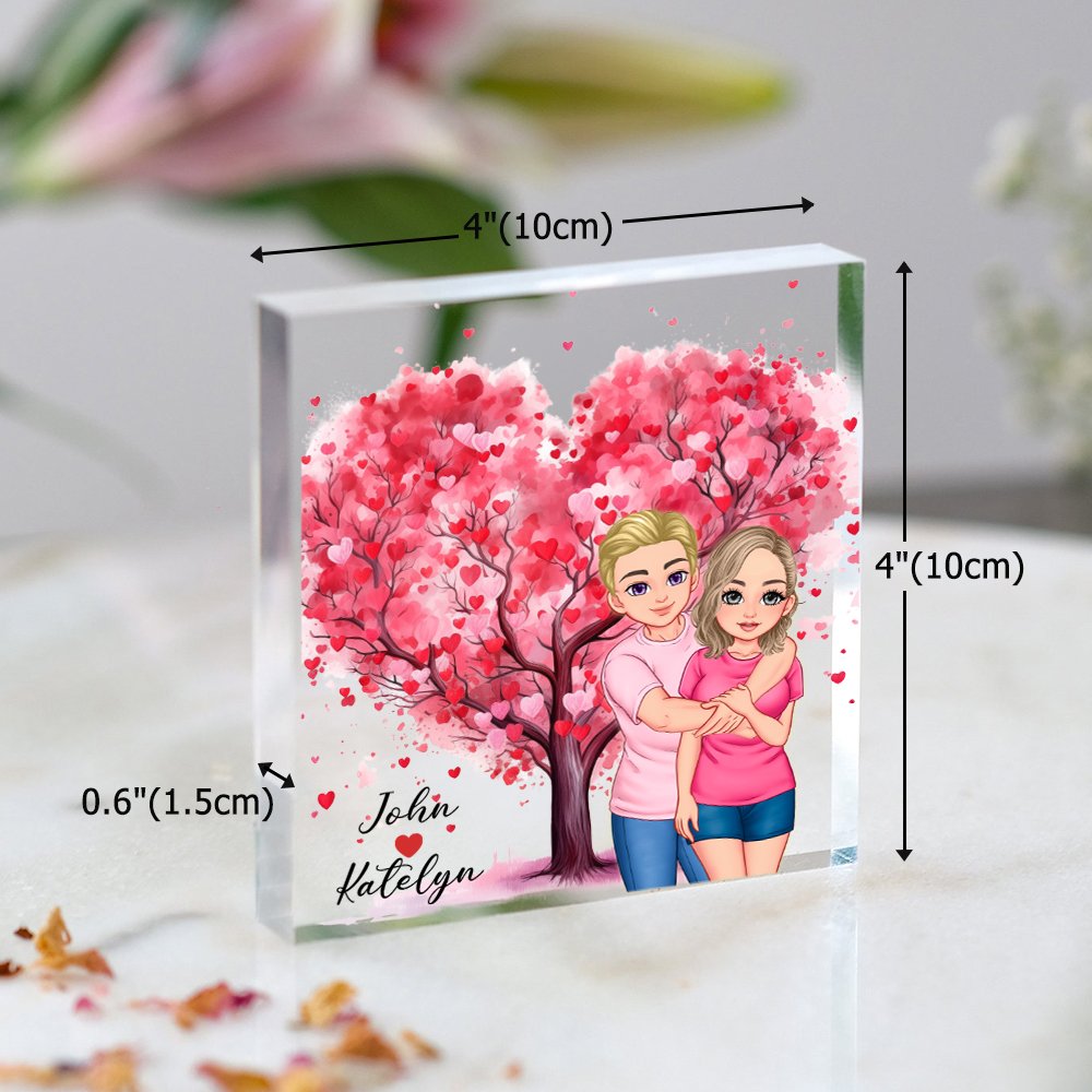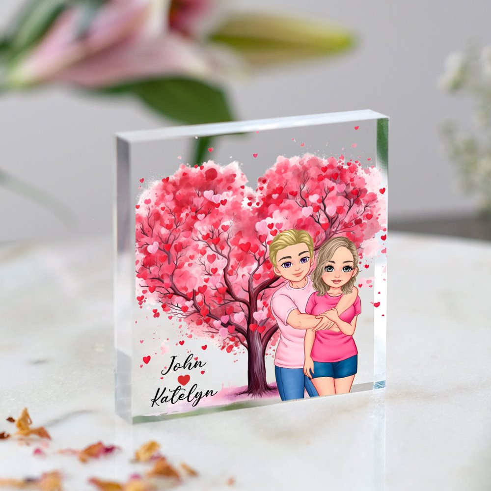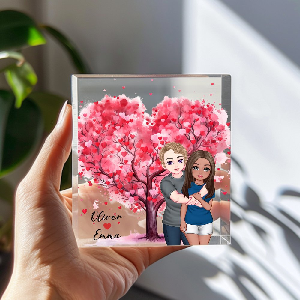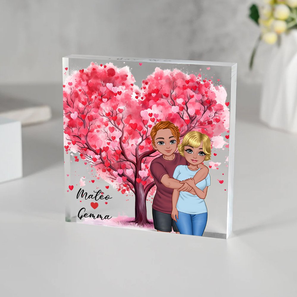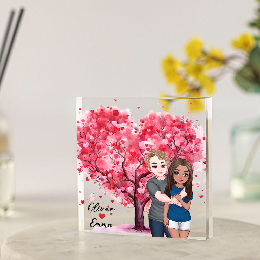 Den här charmiga prydnaden har en personlig kramande seriefigur mot en rosa hjärtträdbakgrund, samtidigt som du kan anpassa dem med allt från hårfärg till byxfärg och namn. Detta är ett hjärtligt sätt att fira ditt förhållande och skapa en unik och unik dekoration.