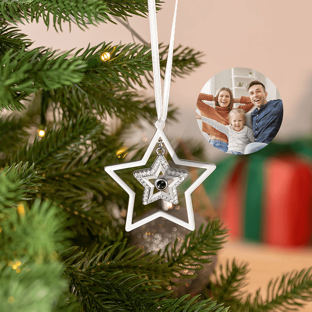 Denna prydnad är designad kring en klassisk femuddig stjärna och har raffinerade linjer och en festlig känsla. Den kan anpassas med ett minnesvärt foto och finns i färg eller svartvitt, vilket förvandlar vanliga juldekorationer till personliga minnessaker som innehåller familjeminnen.
