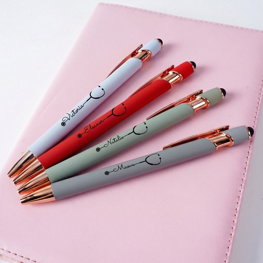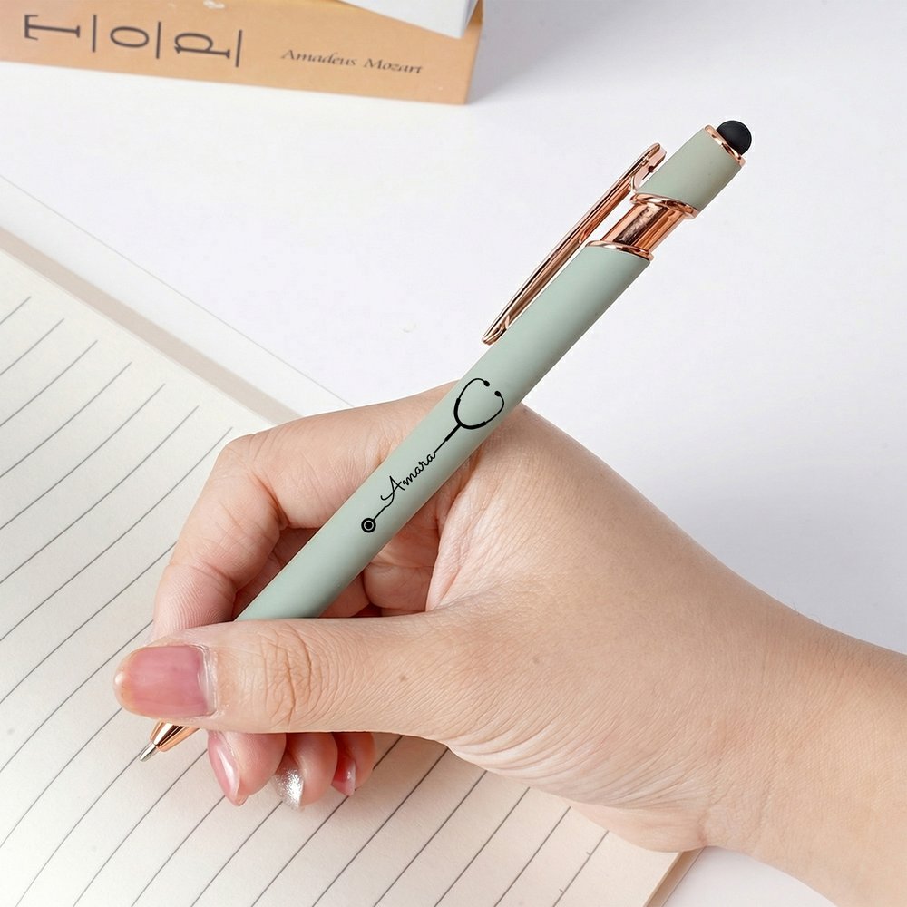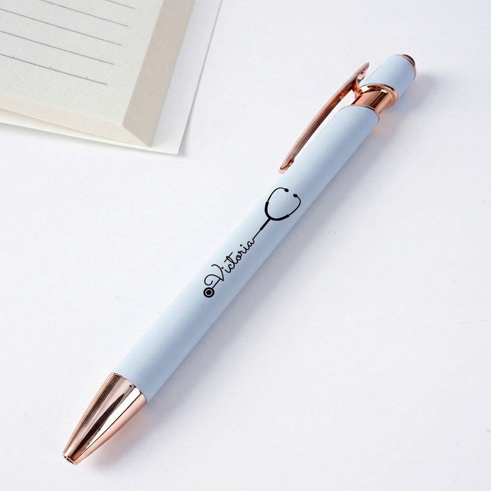 Denna kulspetspenna erbjuder meningsfull personalisering skräddarsydd för medicinsk personal. Du kan välja mellan en rad olika mjuka, matta färger och lägga till ett eget namn tillsammans med ett fint stetoskopmönster. Det klara, hållbara trycket säkerställer att designen förblir levande genom daglig användning, vilket skapar ett unikt skrivverktyg som hyllar mottagarens yrke och unika identitet.