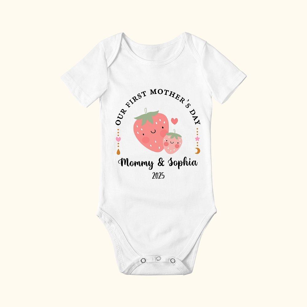 Vårt mönster för babykläder använder den nära relationen mellan söta jordgubbscitron tecknade bilder för att uttrycka kärleken till mödrar och barn. Texten lyder "OUR FIEST MOTHER'S DAY", vilket visar den nära relationen mellan mödrar och barn. Den varma kärleken mellan. Du kan också anpassa texten för att göra baby onesies unika.