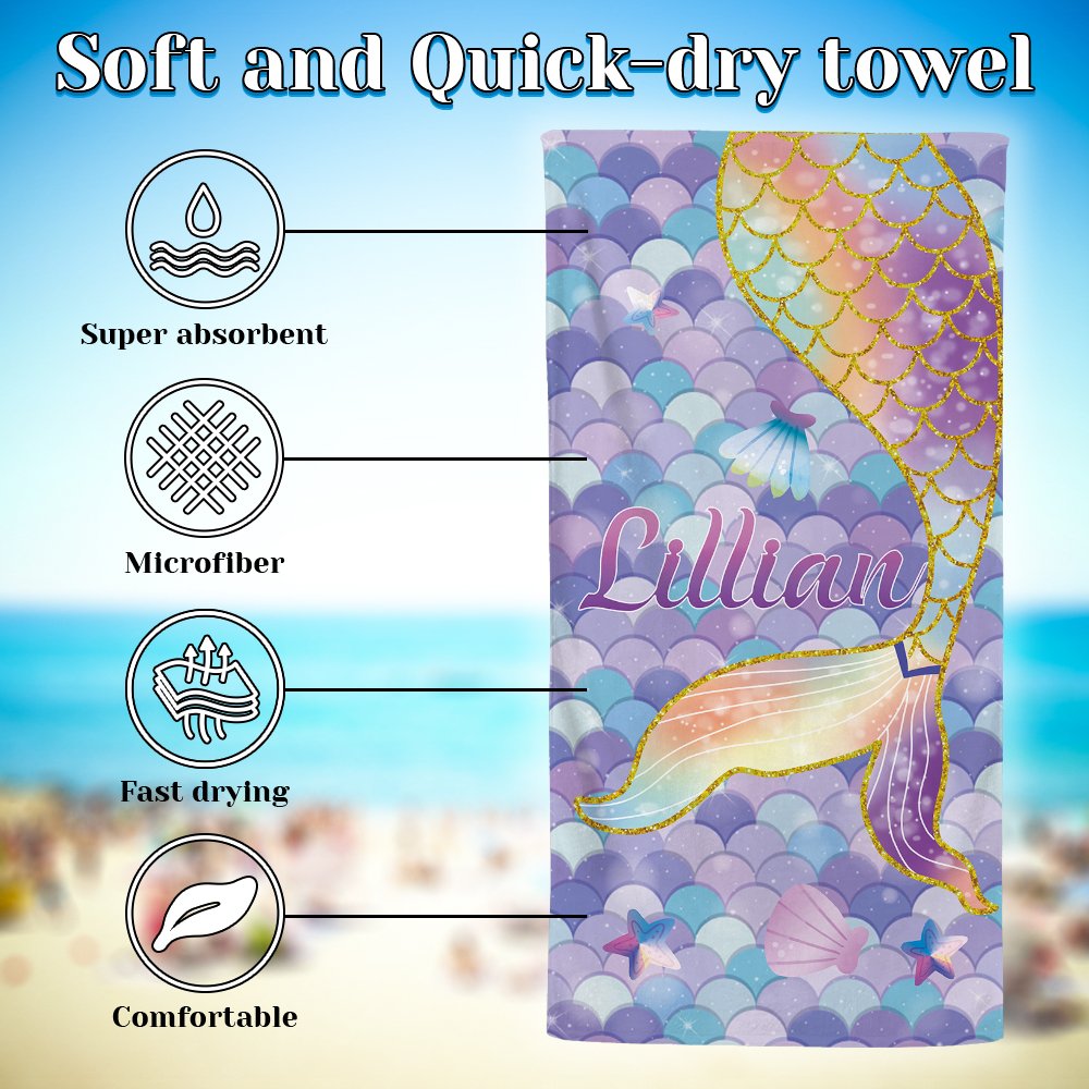 Colorful scales and lifelike fishtails, the mermaid pattern adds a touch of summer and dreamy color to the beach towel, and every stroke and detail is carefully designed. Personalization options allow you to add your name to the towel, making it an even more unique and special gift.