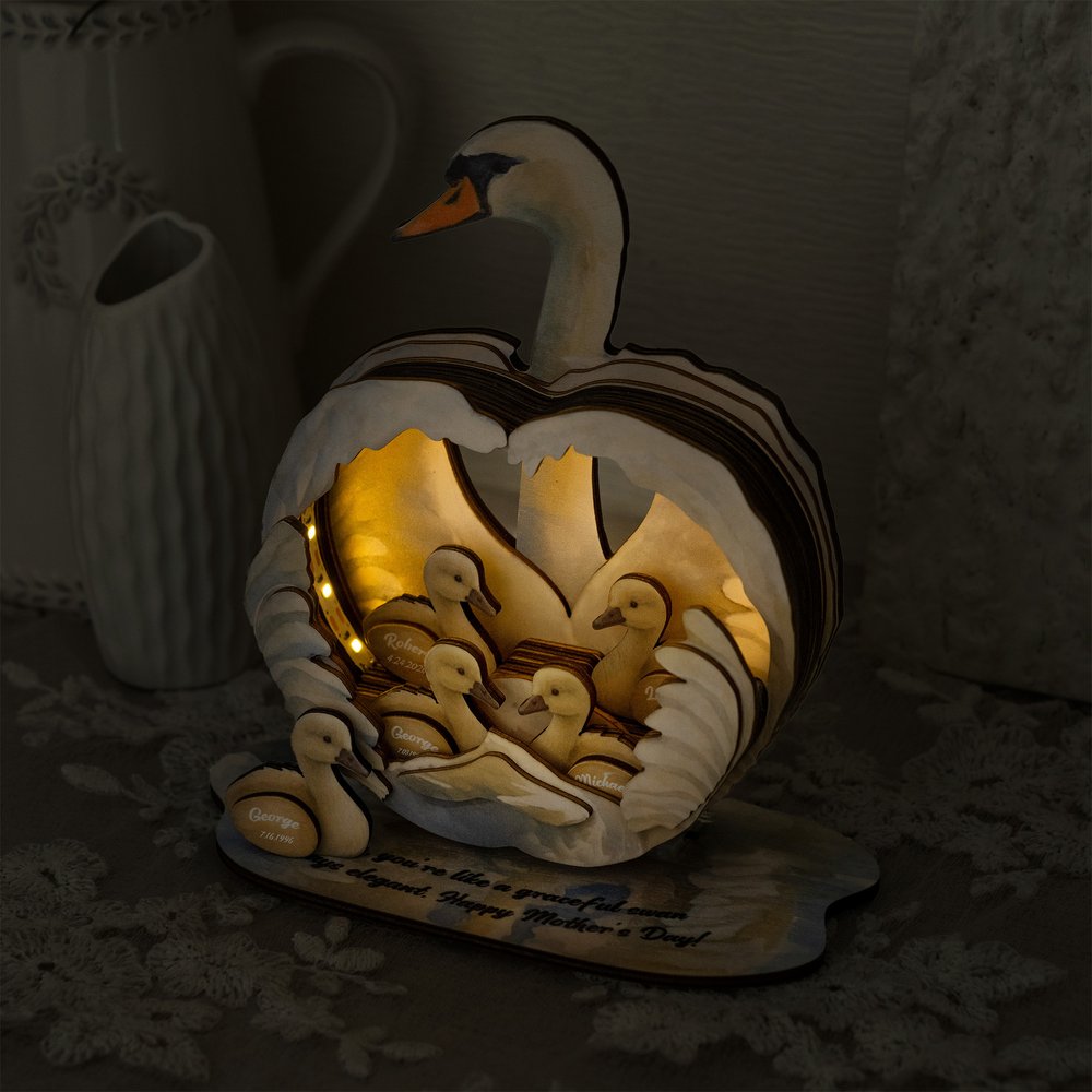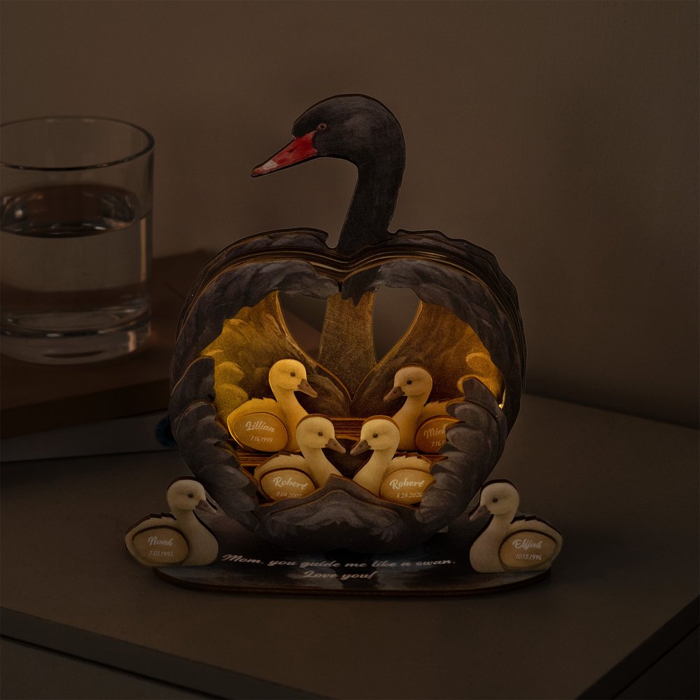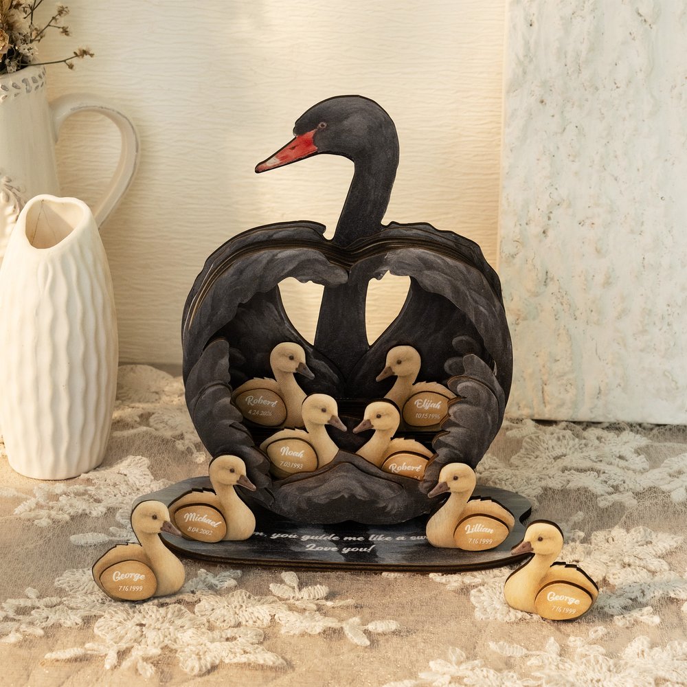 Inspirerad av en svanmamma som skyddar sina ungar, har denna tavla 1-8 söta svanungar och kan anpassas med personlig text. Dess varma och lugnande design fångar perfekt kärnan i familjeband. Svanen symboliserar moderskärlek och skydd. Flera svanungar passar familjer med barn och framhäver starka familjeband. Denna prydnad blir ett konkret uttryck för tillgivenhet och blandar dekorativt tilltal med känslomässigt värde.