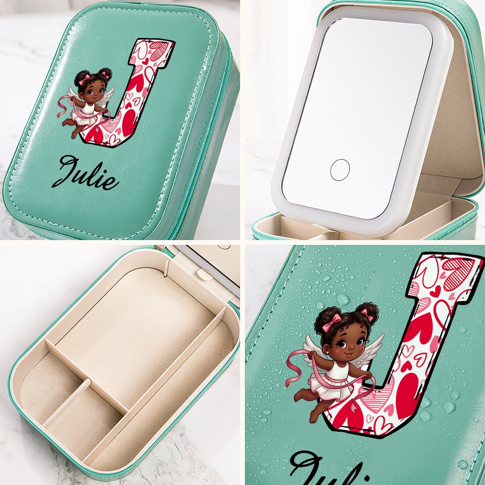 Personlig Sweet Cupid Angel PU läder smyckeskrin med namn och justerbar trefärgad LED-spegel Alla hjärtans dag Jubileumspresent för kvinnor