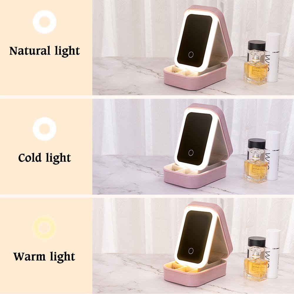 Spegeln är utrustad med en LED-lampa med tre justerbara ljuslägen: varmt ljus, naturligt ljus och kallt ljus, vilket skapar olika atmosfärer. Den levereras med en laddningskabel och håller i ungefär en vecka på en enda laddning. Oavsett om du förbereder dig för en dejt eller kopplar av på semestern kan du välja den belysning som passar dig bäst. Den här praktiska spegeln är perfekt för touch-ups och för att kontrollera din makeup.